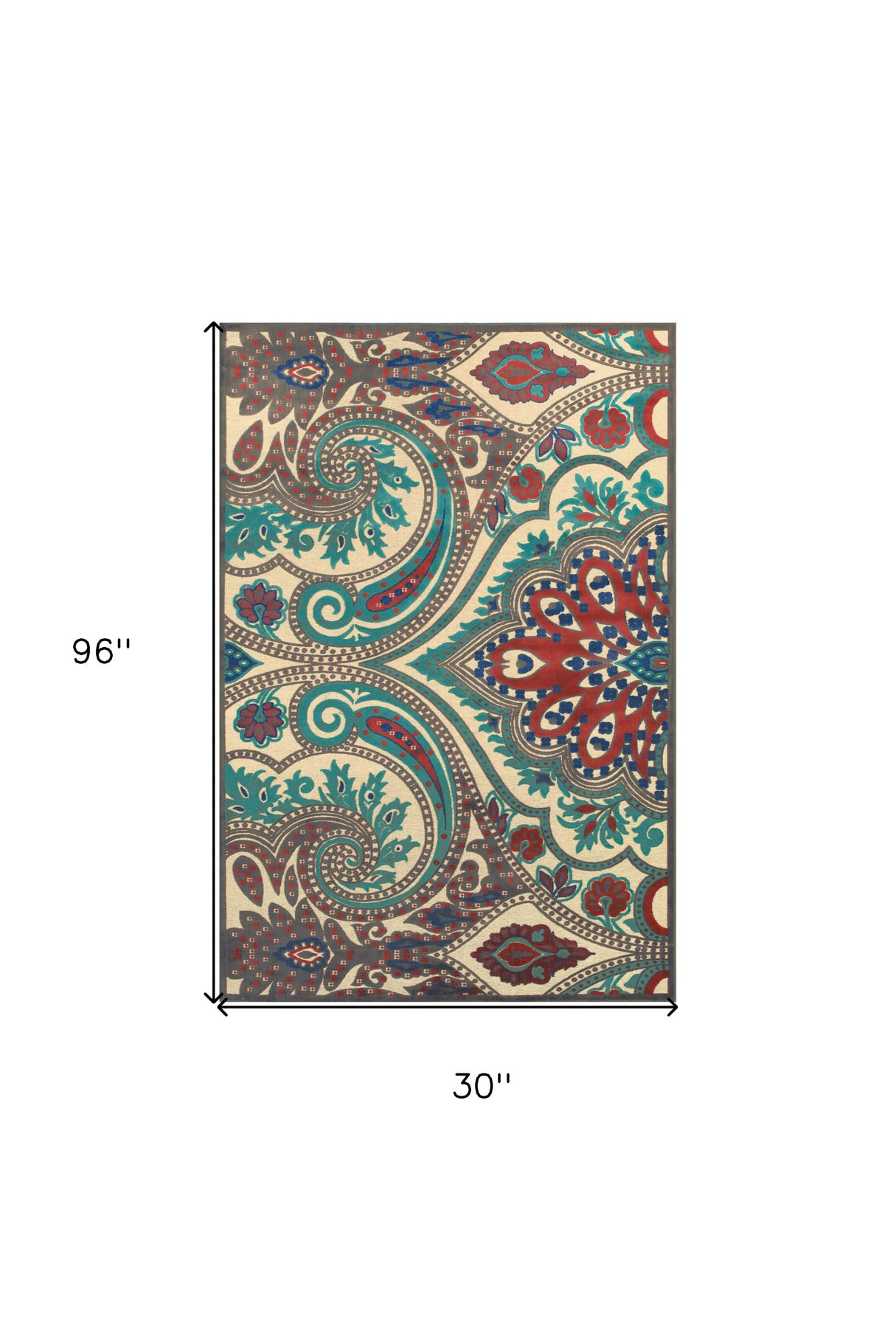 Add some artistry to your room with this 8-foot tan blue and taupe paisley power loom runner rug. This runner shaped rug features a paisley design that will add a functional and decorative accent to your space. This smaller sized rug is just what you need for your walkway, or in front of door, cabinet, refrigerator, or chair. 30-inch h x 96-inch w x 0.24-inch d