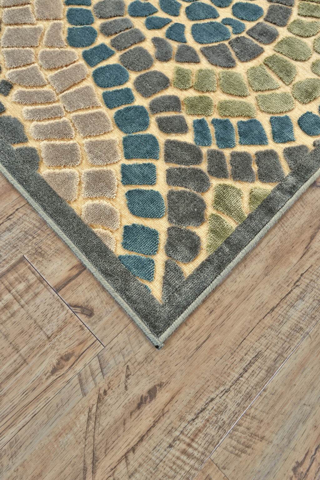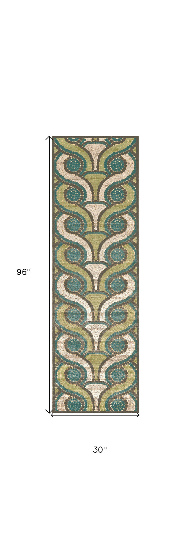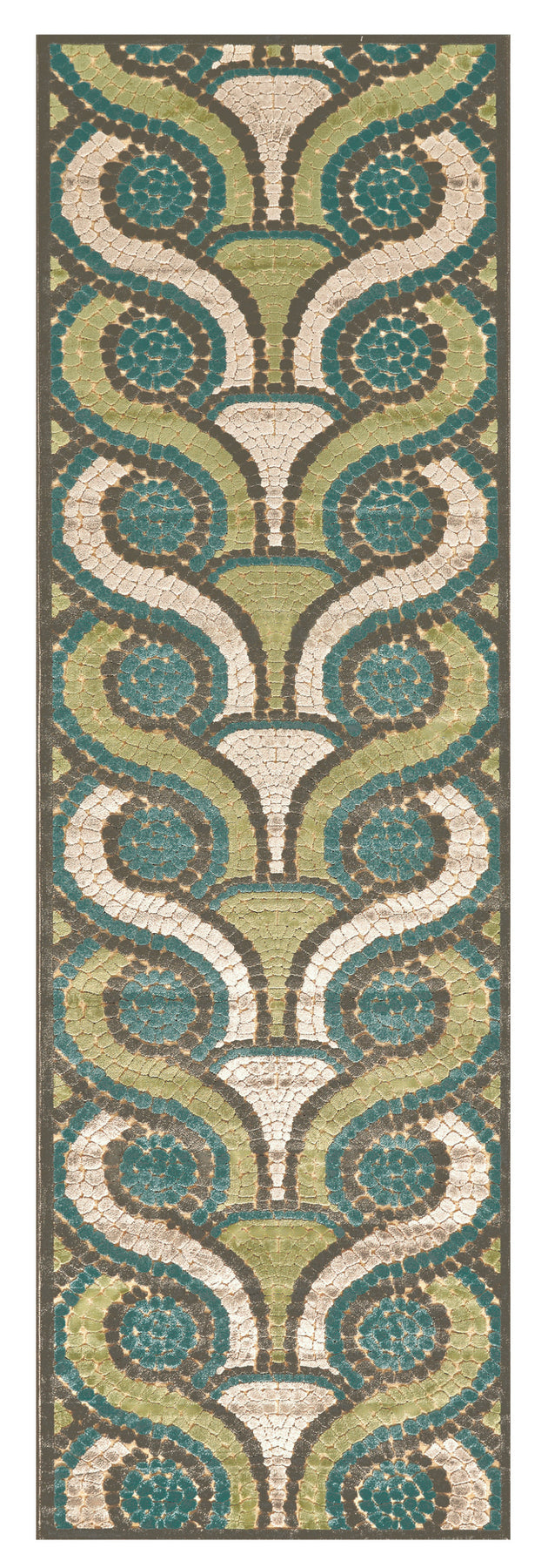 Add some artistry to your room with this 8-foot tan blue and green geometric power loom runner rug. This runner shaped rug features a geometric design that will add a functional and decorative accent to your space. This smaller sized rug is just what you need for your walkway, or in front of door, cabinet, refrigerator, or chair. 30-inch h x 96-inch w x 0.24-inch d