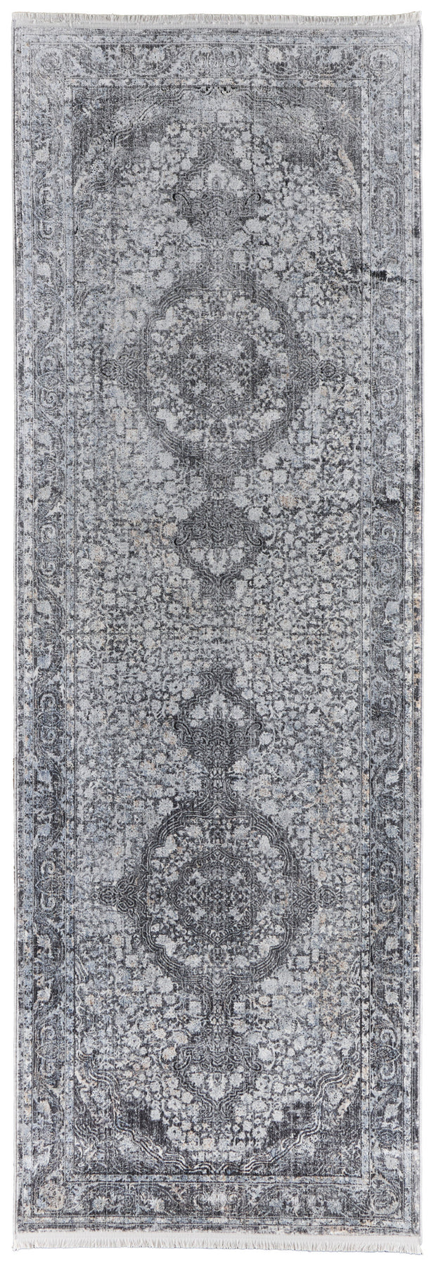 This 8-foot gray and silver oriental power loom worn faded runner rug, is a great way to add warmth to a room. This runner shaped rug features a oriental design in gray and silver to give it visual interest. A classic shape marries with good looking design for your space area rugs help to give warmth and sense of home to your space. 32-inch H x 96-inch W x 0.22-inch D
