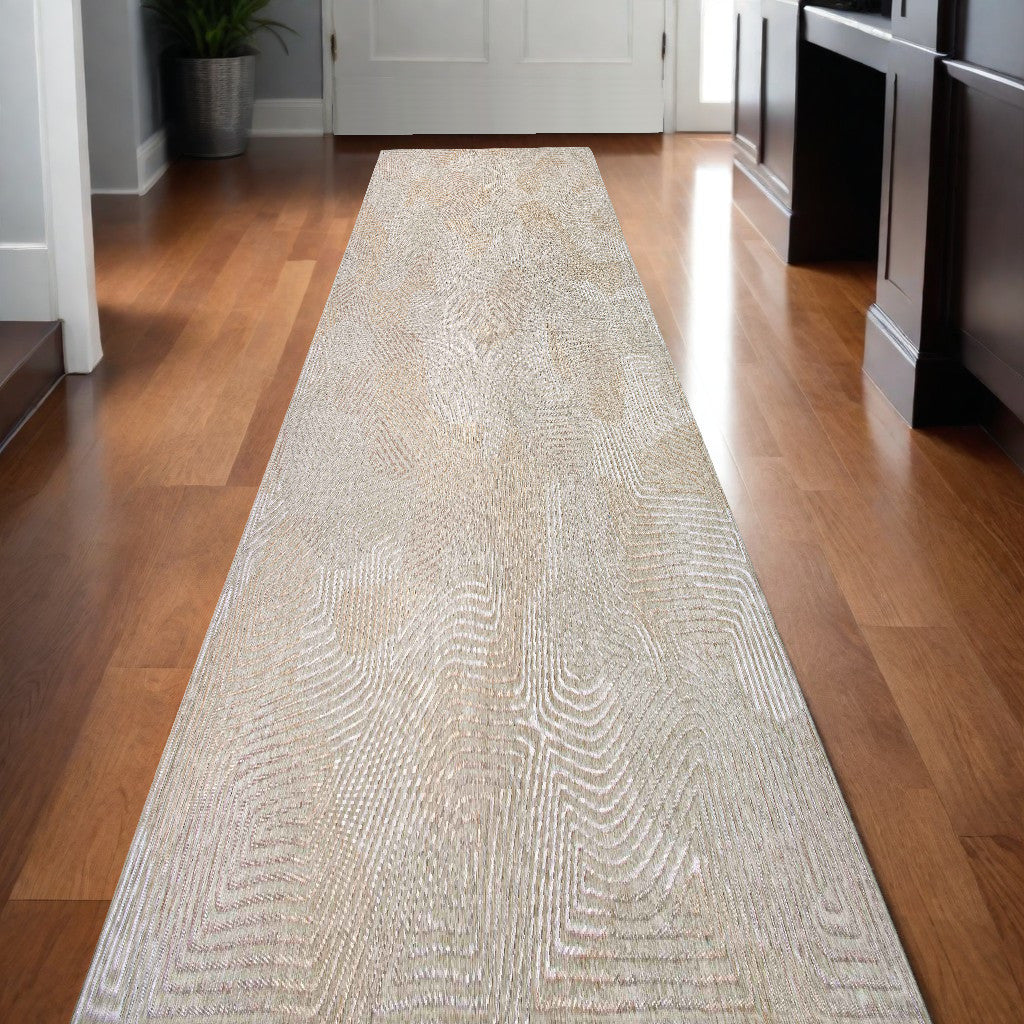 Set an inviting tone in your space with this 10-foot beige and white abstract runner rug. Crafted from eco-friendly 100% pet fibers that are made from recycled water bottles and other biodegradable items to give this rug a comfortable feel, stain resistance and the added benefit of reducing waste in our landfills. Rugs are a great way to showcase your style, hide imperfections, warm your home and reduce noise. This rectangular shaped rug features a abstract design that will add a functional and decorative accent to your space. This modern style runner makes a great accent for the hallway, in front of cabinets, in the laundry room, or any other space you need a narrow and long rug. 31-inch h x 96-inch w x 0.2-inch d.