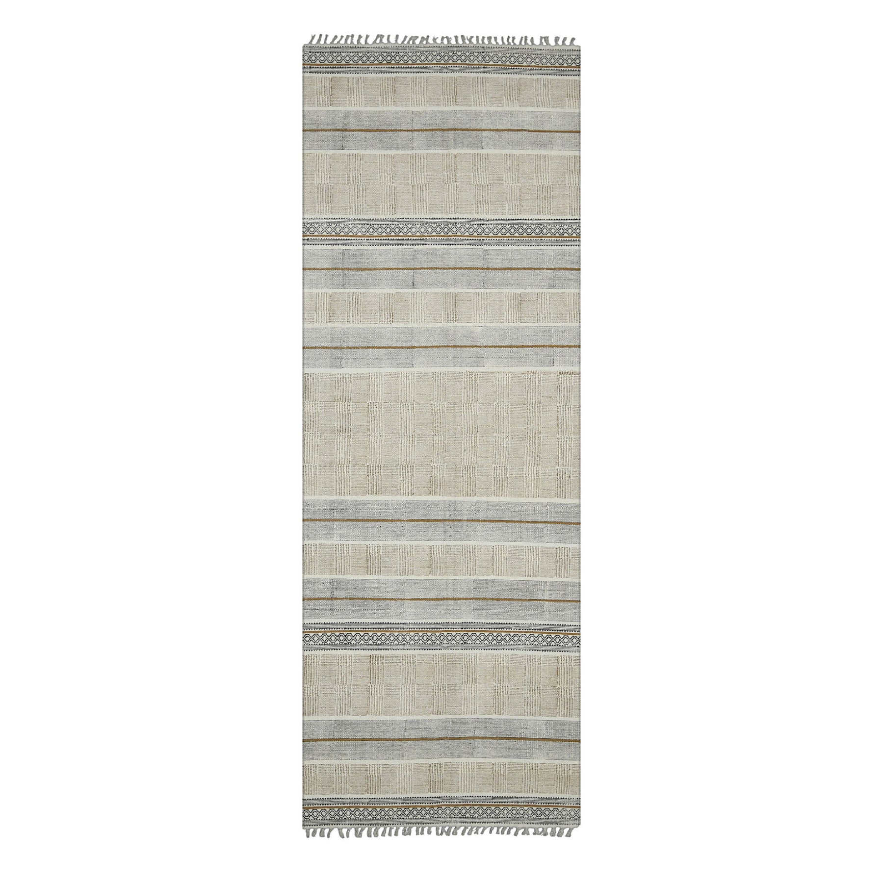 Add some artistry to your room with this 8 feet brown geometric flatweave handmade distressed runner rug with fringe. This runner shaped rug features a geometric design in brown to give it visual interest. A classic shape marries with good looking design for your space Tassel ends bring a timeless and fashionable look to your interior. Area Rugs help to give warmth and sense of home to your space. 0.2 inches H x 30 inches W x 96 inches D