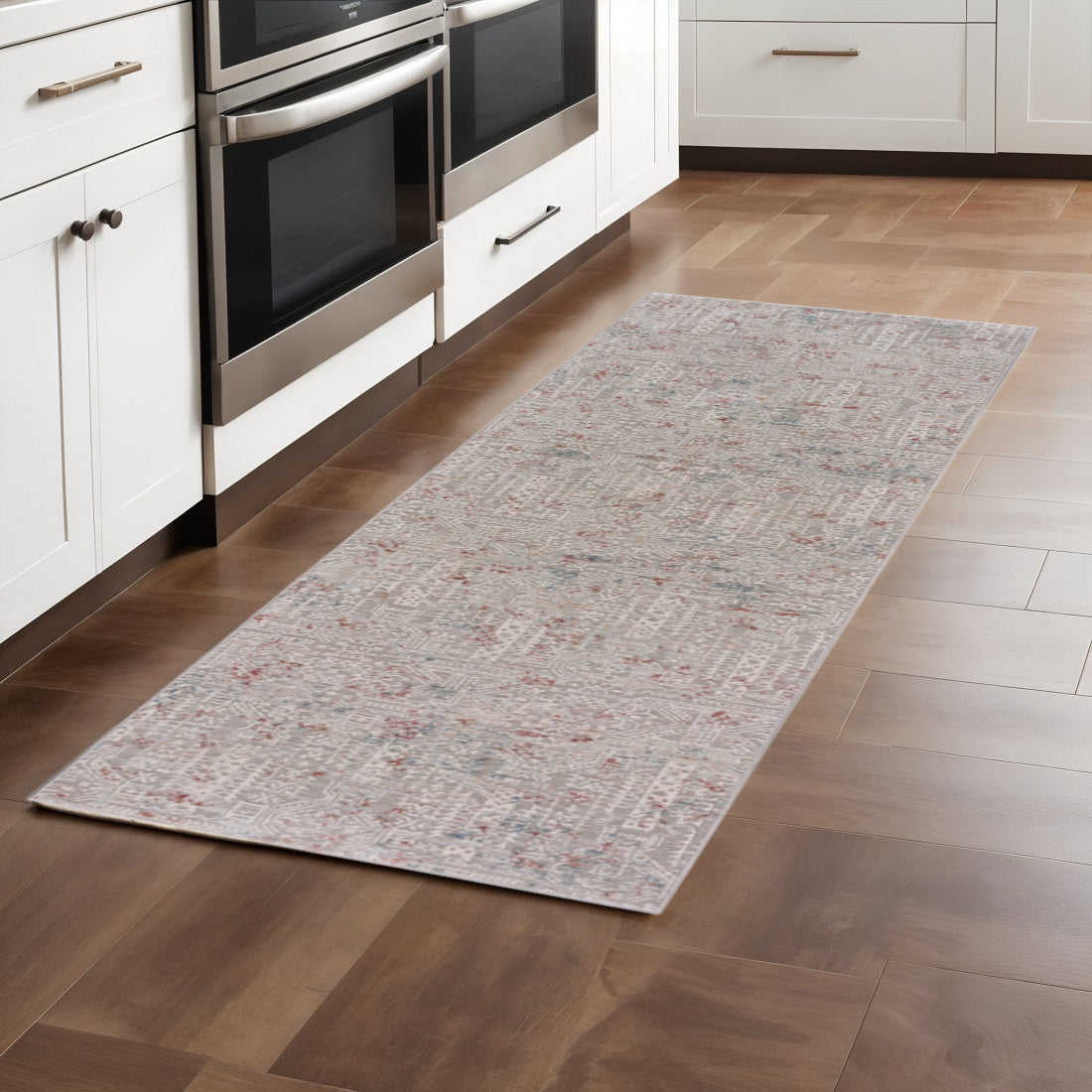 Add great coloration and comfortable texture to your space with this 8' gray ivory slate blue and wine red geometric distressed runner rug. This runner shaped rug features a geometric design in gray ivory slate blue and wine red to give it visual interest. A classic shape marries with good looking design for your space Made in Turkey, this rug offers high quality combined with good looking designer sensibilities. Ideal for spaces with kids and pets, this rug is stain resistant to help repel stains and spilled liquids. Place this area rug against a hardwood or tile floor and it will enliven your living space with style and sophistication. 0.2" H x 24" W x 96" D