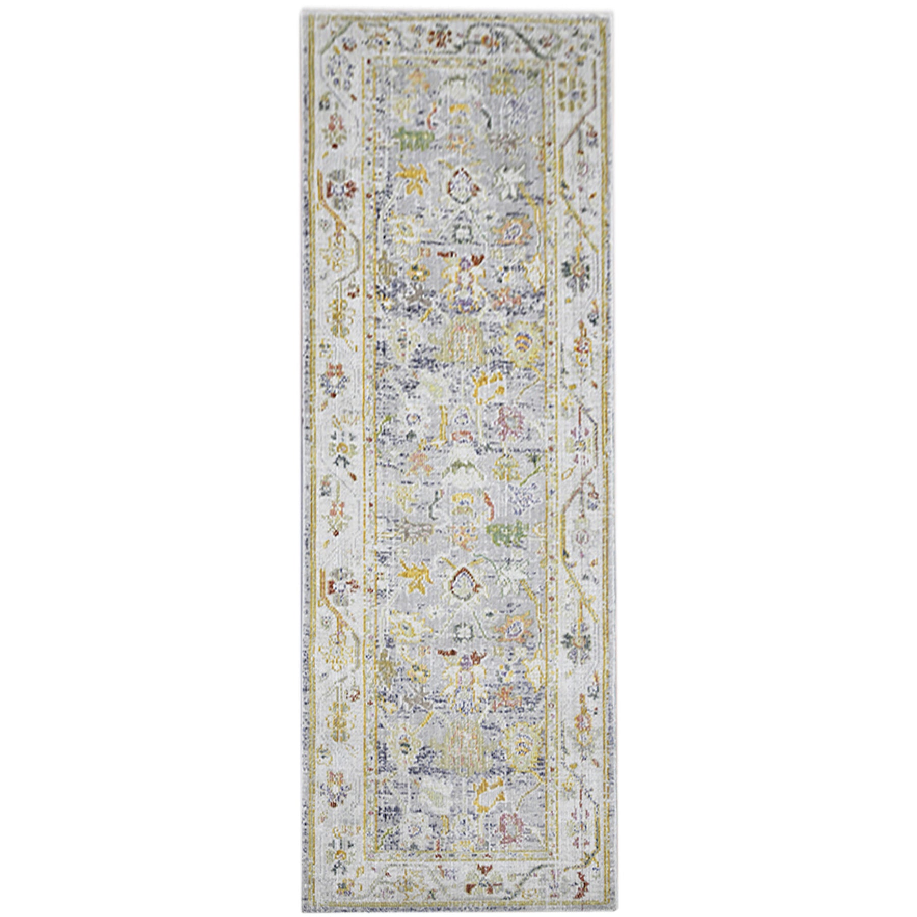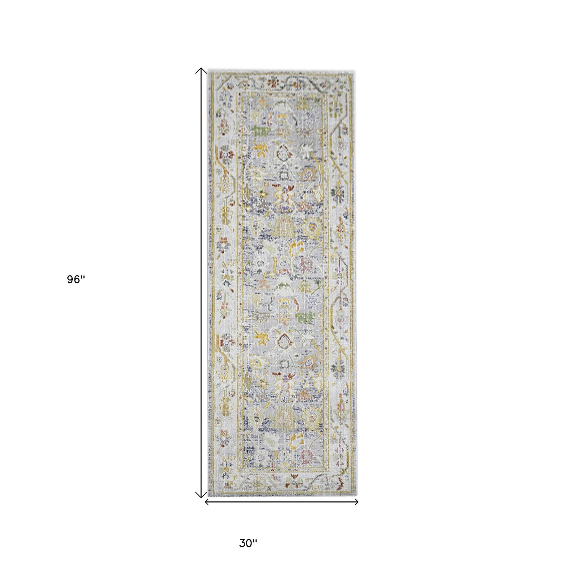 This 8-foot ivory blue and charcoal floral runner rug, is a great way to add warmth to a room. Built to last, this rug crafted from polyester fibers is known for its durability and long lasting appeal. Rugs are a great way to showcase your style, hide imperfections, warm your home and reduce noise. This rectangular shaped rug features a abstract design that will add a functional and decorative accent to your space. This contemporary style runner makes a great accent for the hallway, in front of cabinets, in the laundry room, or any other space you need a narrow and long rug. 30-inch h x 96-inch w x 0.08-inch d.