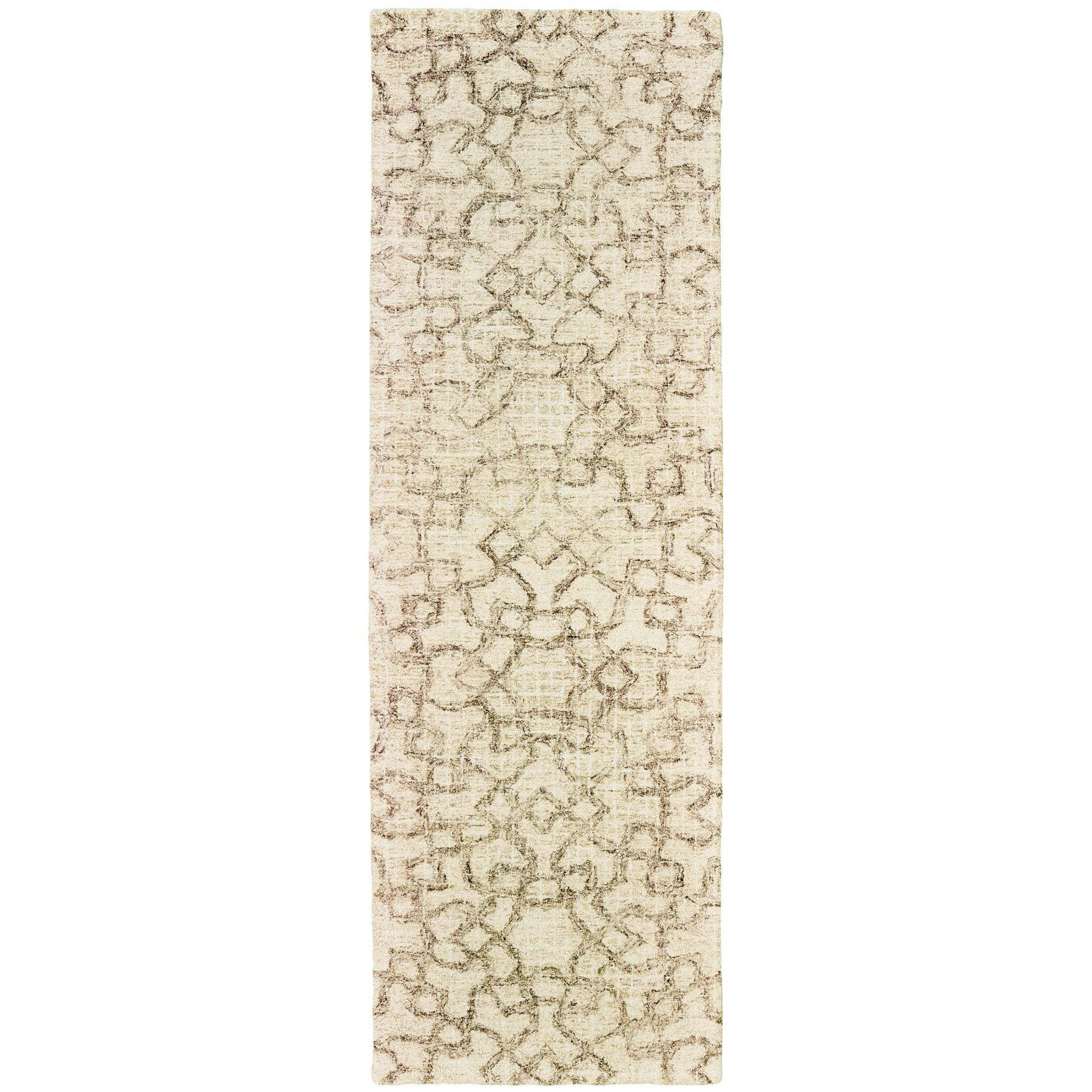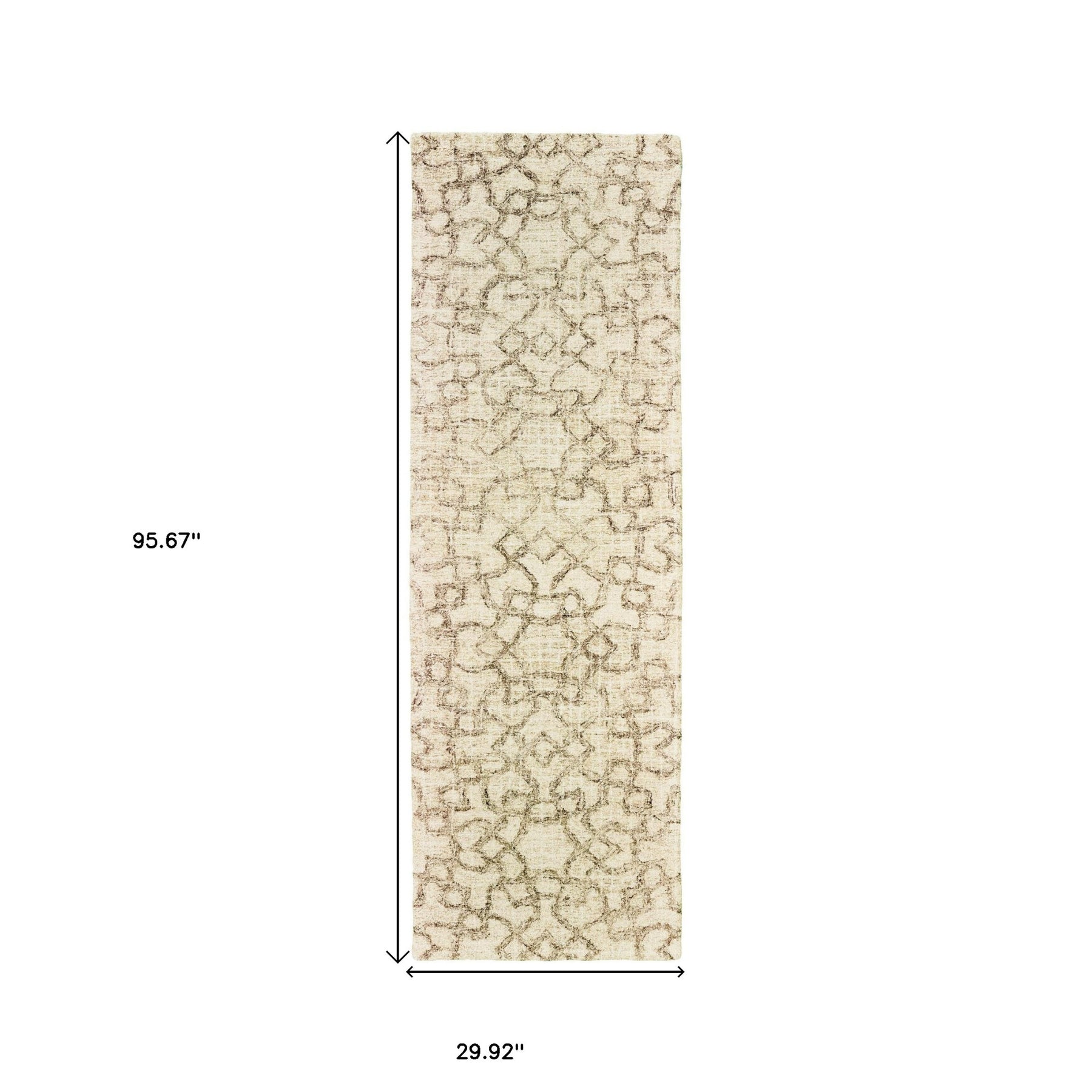 Set an inviting tone in your space with this 8-foot tan wool geometric hand tufted runner rug. This runner shaped rug features a geometric design in tan to give it visual interest. A classic shape marries with good looking design for your space the coloring of this rug adds a delightfully neutral tone to your home and will easily match with most any decor. Area rugs help to give warmth and sense of home to your space. 29.92-inch H x 95.67-inch W x 0.39-inch D