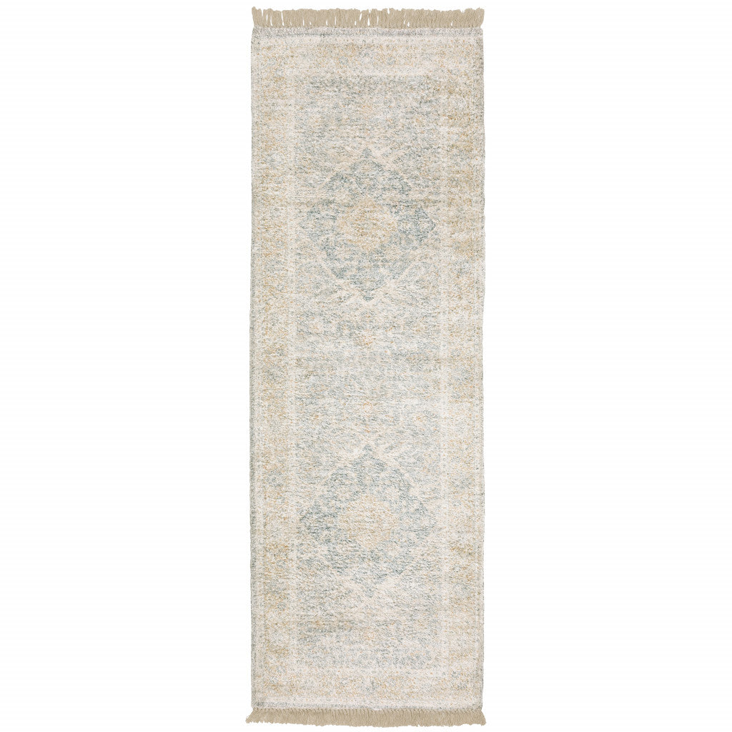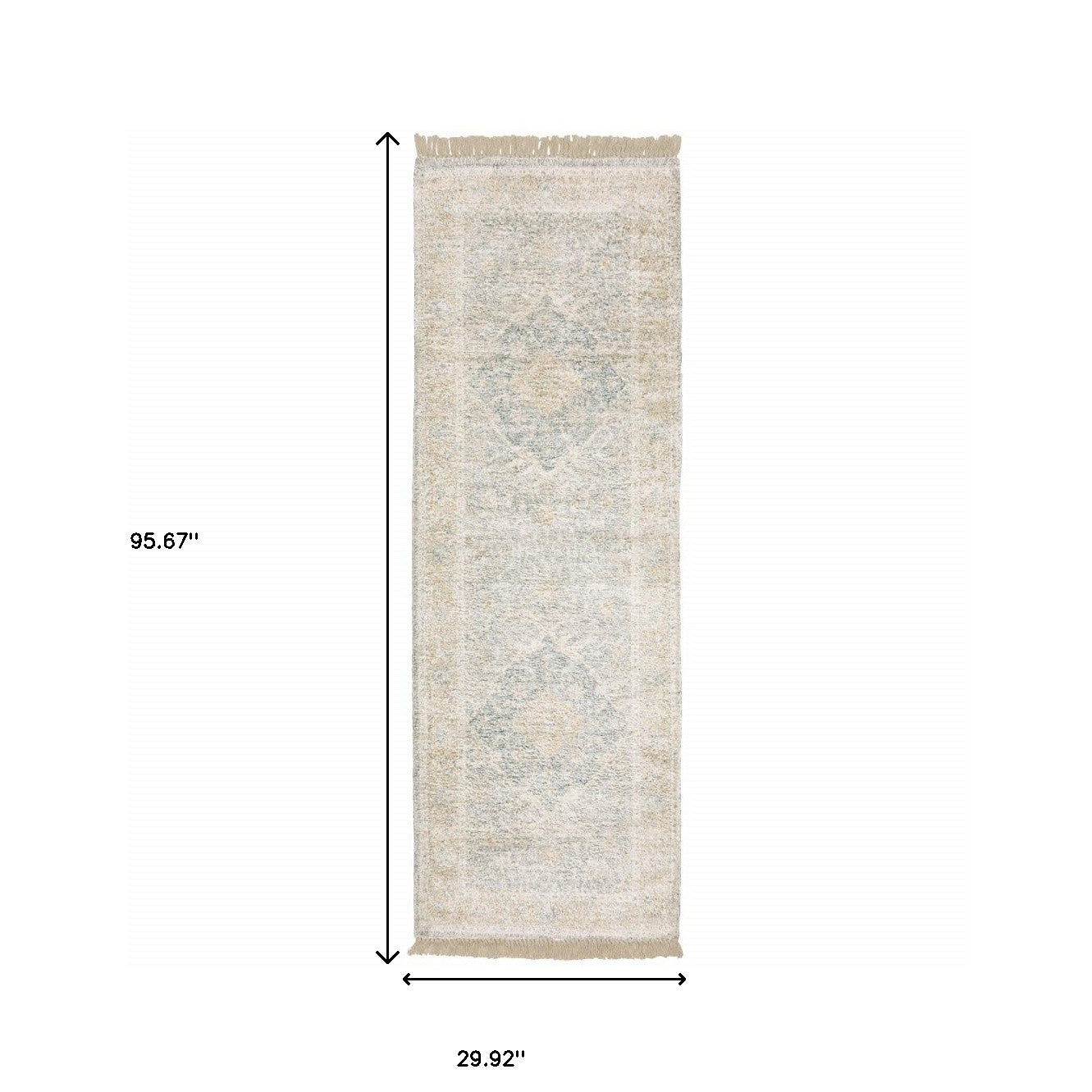 Set an inviting tone in your space with this 8-foot gray and beige oriental hand loomed distressed runner rug with fringe. Ideal for spaces with kids and pets, this rug is stain resistant to help repel dirt and spilled liquids. Crafted by skilled artisans, this hand loomed rug is genuine and unique. No two will be exactly alike. Built to last, this rug crafted from polyester and viscose fibers is known for its durability and long lasting appeal. Rugs are a great way to showcase your style, hide imperfections, warm your home and reduce noise. Tassel ends bring a timeless and fashionable look to your interior. 29.92-inch h x 95.67-inch w x 0.23-inch d.