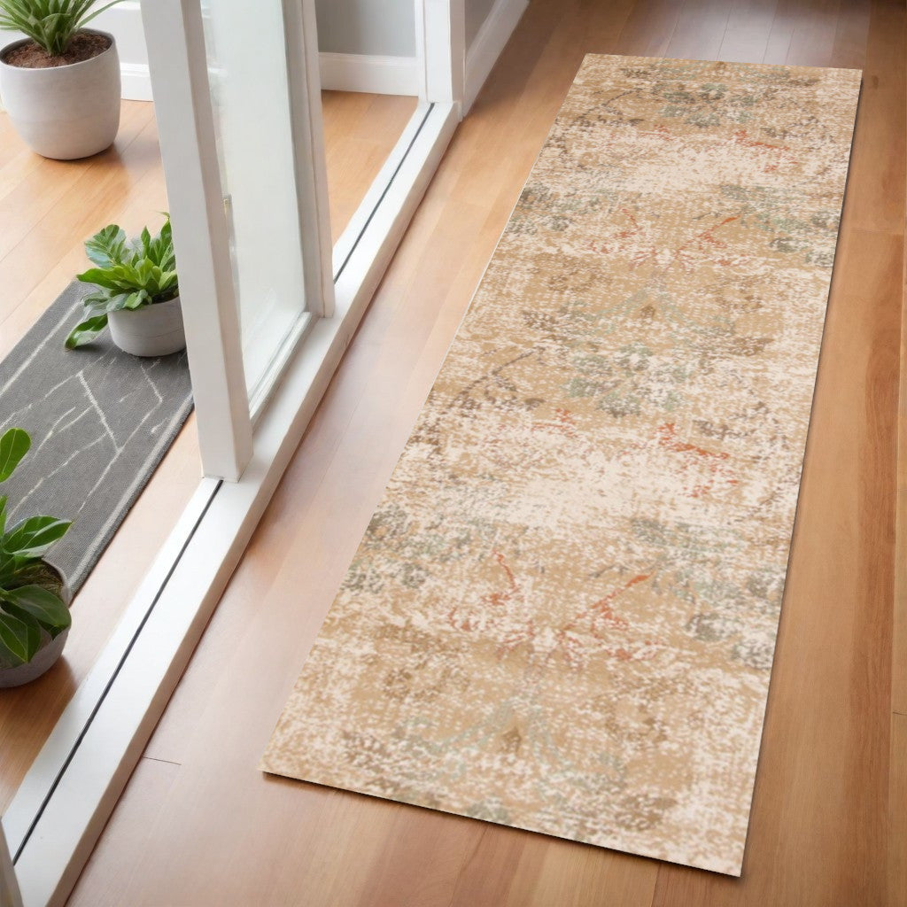 This 7-foot beige damask runner rug, is a great way to add warmth to a room. Built to last, this rug crafted from polypropylene fibers is known for its durability and long lasting appeal. Rugs are a great way to showcase your style, hide imperfections, warm your home and reduce noise. This rectangular shaped rug features a abstract design that will add a functional and decorative accent to your space. This traditional style runner makes a great accent for the hallway, in front of cabinets, in the laundry room, or any other space you need a narrow and long rug. 26-inch h x 95-inch w x 0.5-inch d.