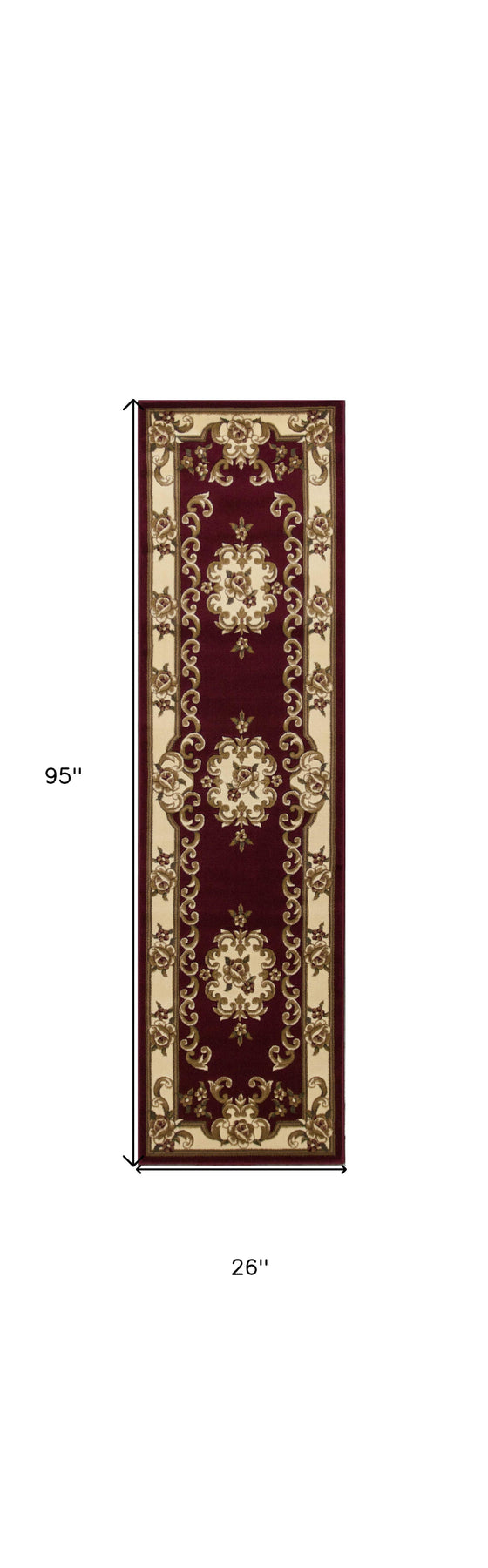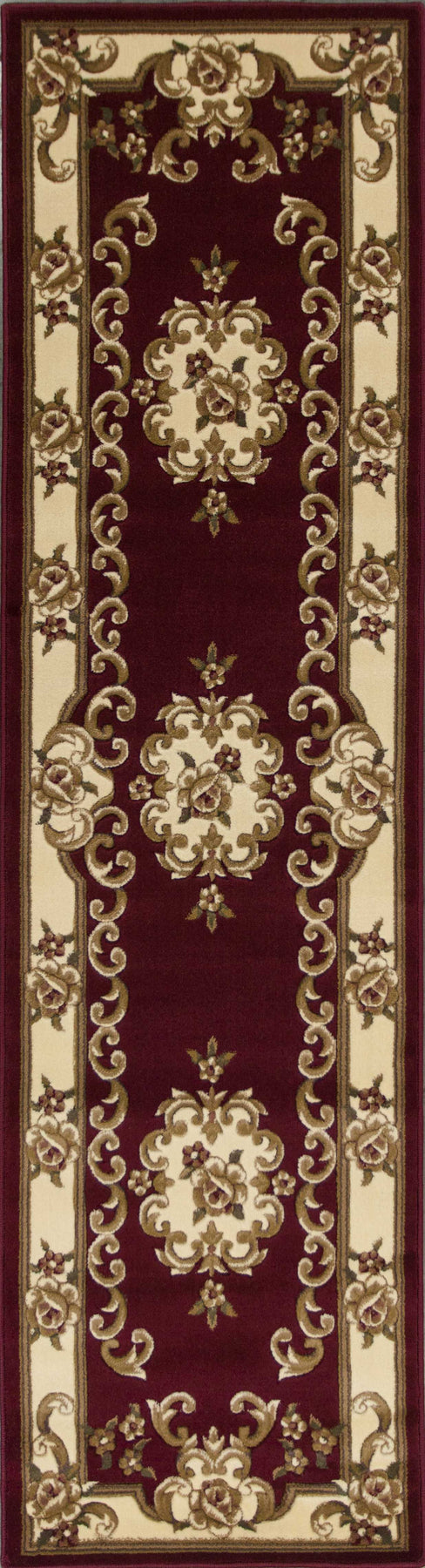 Add some artistry to your room with this 8-foot red and ivory floral border runner rug. This rectangular shaped rug features a Victorian style Aubusson floral design in deep red and ivory to give it visual interest. A classic shape marries with good looking design for your space ideal for spaces with kids and pets, this rug is stain resistant to help repel stains and spilled liquids. Area rugs help to give warmth and sense of home to your space. 26-inch H x 95-inch W x 0.5-inch D