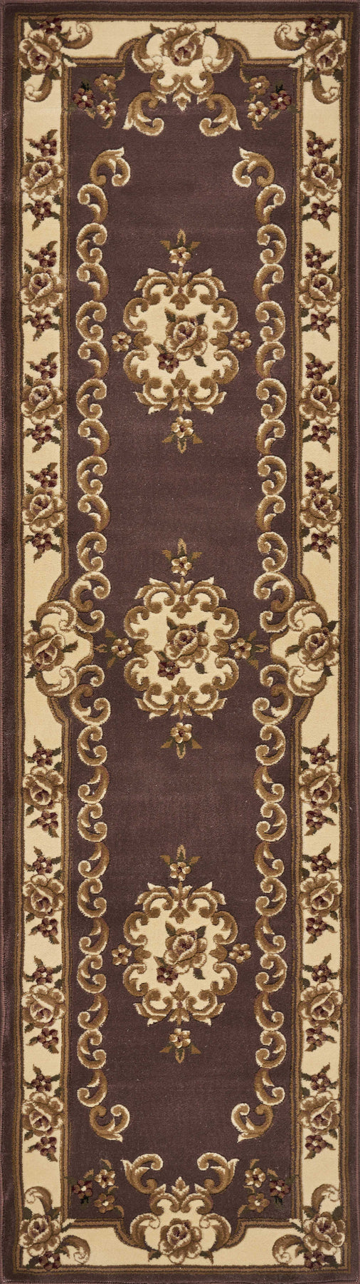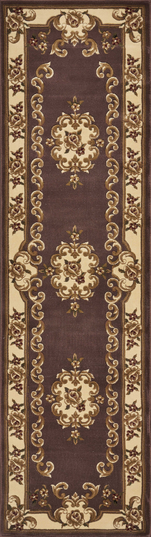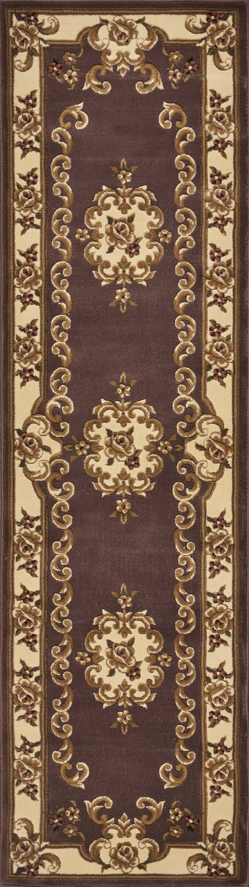 Adorn your home with this bewitching plum/ivory aubusson rug, which will turn your floor into art. Its a beguiling piece, which will certainly spruce up the ambiance of your home and get rid of monotony. This rug is a hard wearing piece machine-woven in China of 100% heat-set polypropylene and hand-carved with specific attention to detail. Its beautiful blend of yesterday and today will give an appealing modern feel to the look and feel of your home. As for measurements, they are 1/2 for height, 2' for width, and 7'' for depth. To care for it, vacuum it regularly and spot clean any stains. Its also recommended that you have it professionally cleaned occasionally. If you want a beautiful and useful rug that can fit in well with any interior, this is the one for you. Actual Dimensions: 2'2" x 7'11"