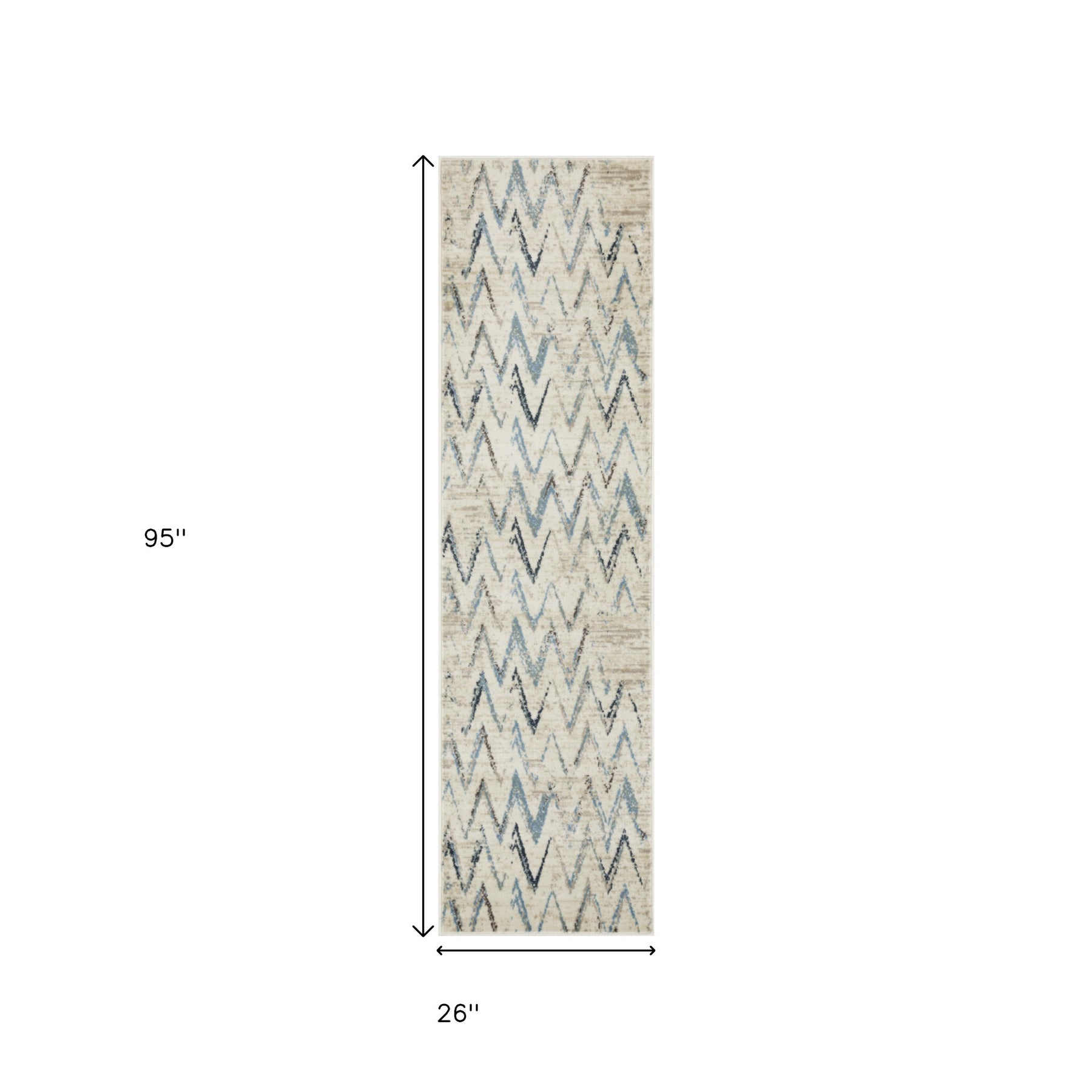 Add some artistry to your room with this 8-foot ivory chevron runner rug. Ideal for spaces with kids and pets, this rug is stain resistant to help repel dirt and spilled liquids. Built to last, this rug crafted from polypropylene fibers is known for its durability and long lasting appeal. Rugs are a great way to showcase your style, hide imperfections, warm your home and reduce noise. This rectangular shaped rug features a abstract design that will add a functional and decorative accent to your space. This contemporary style runner makes a great accent for the hallway, in front of cabinets, in the laundry room, or any other space you need a narrow and long rug. 26-inch h x 95-inch w x 0.5-inch d.