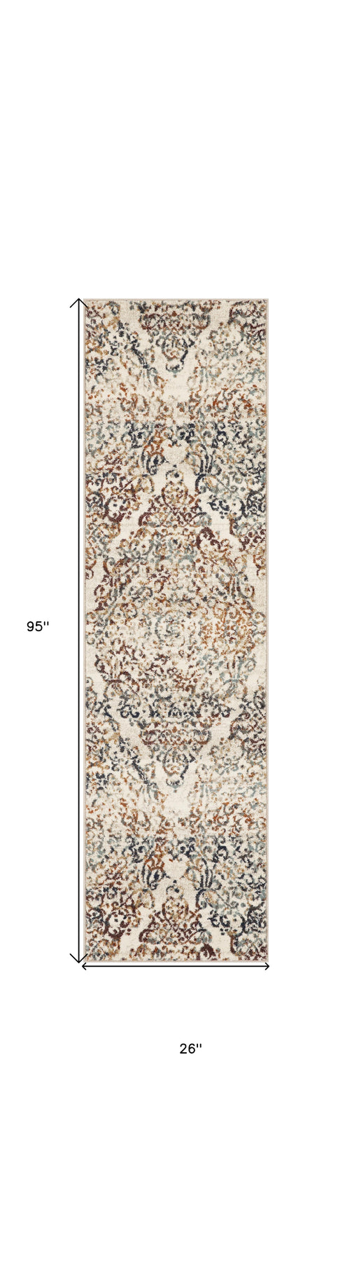 This 8-foot ivory oriental runner rug, is a great way to add warmth to a room. Ideal for spaces with kids and pets, this rug is stain resistant to help repel dirt and spilled liquids. Built to last, this rug crafted from polypropylene fibers is known for its durability and long lasting appeal. Rugs are a great way to showcase your style, hide imperfections, warm your home and reduce noise. This rectangular shaped rug features a abstract design that will add a functional and decorative accent to your space. This contemporary style runner makes a great accent for the hallway, in front of cabinets, in the laundry room, or any other space you need a narrow and long rug. 26-inch h x 95-inch w x 0.5-inch d.