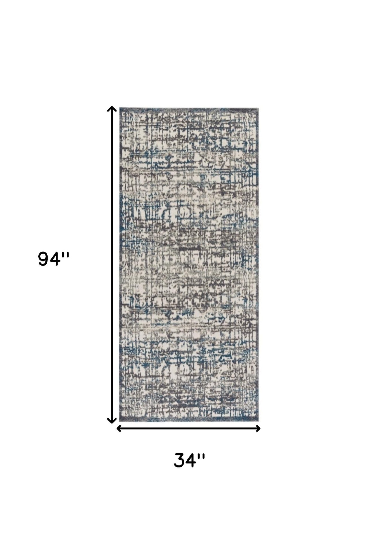 Add great coloration and comfortable texture to your space with this 8-foot gray ivory and blue abstract power loom runner rug. This runner shaped rug features a abstract design that will add a functional and decorative accent to your space. Ideal for spaces with kids and pets, this rug is stain resistant to help repel dirt and spilled liquids. This smaller sized rug is just what you need for your walkway, or in front of door, cabinet, refrigerator, or chair. 34-inch h x 94-inch w x 0.49-inch d