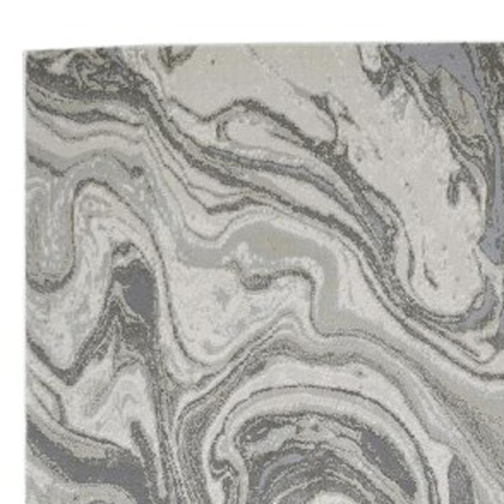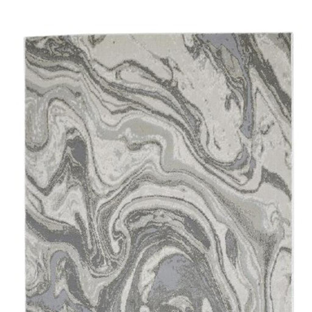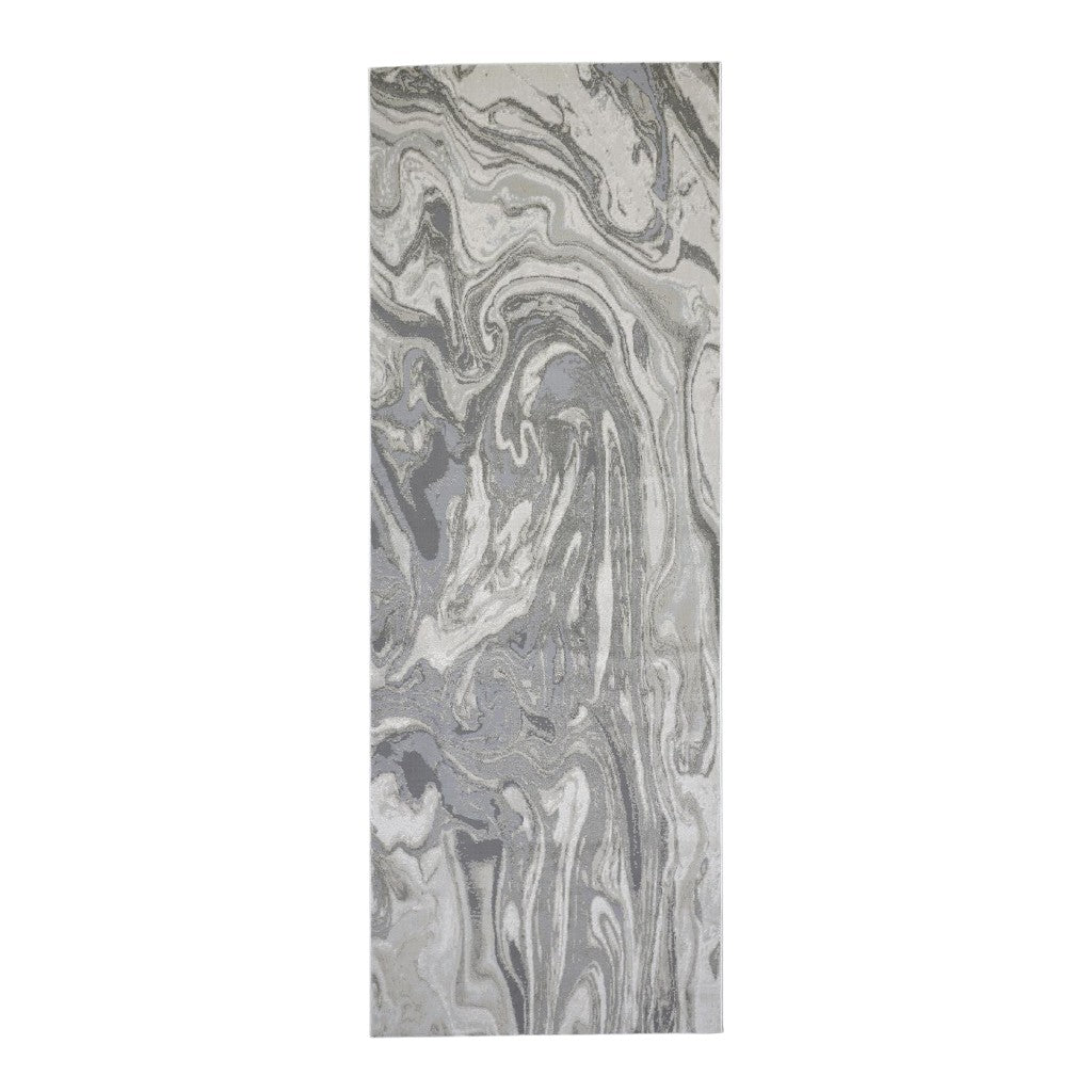 Add some artistry to your room with this 8-foot gray ivory and silver abstract power loom distressed runner rug. This runner shaped rug features a abstract design that will add a functional and decorative accent to your space. Ideal for spaces with kids and pets, this rug is stain resistant to help repel dirt and spilled liquids. This smaller sized rug is just what you need for your walkway, or in front of door, cabinet, refrigerator, or chair. 34-inch h x 94-inch w x 0.39-inch d
