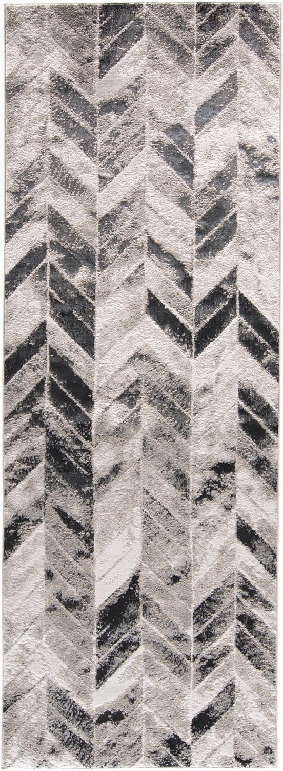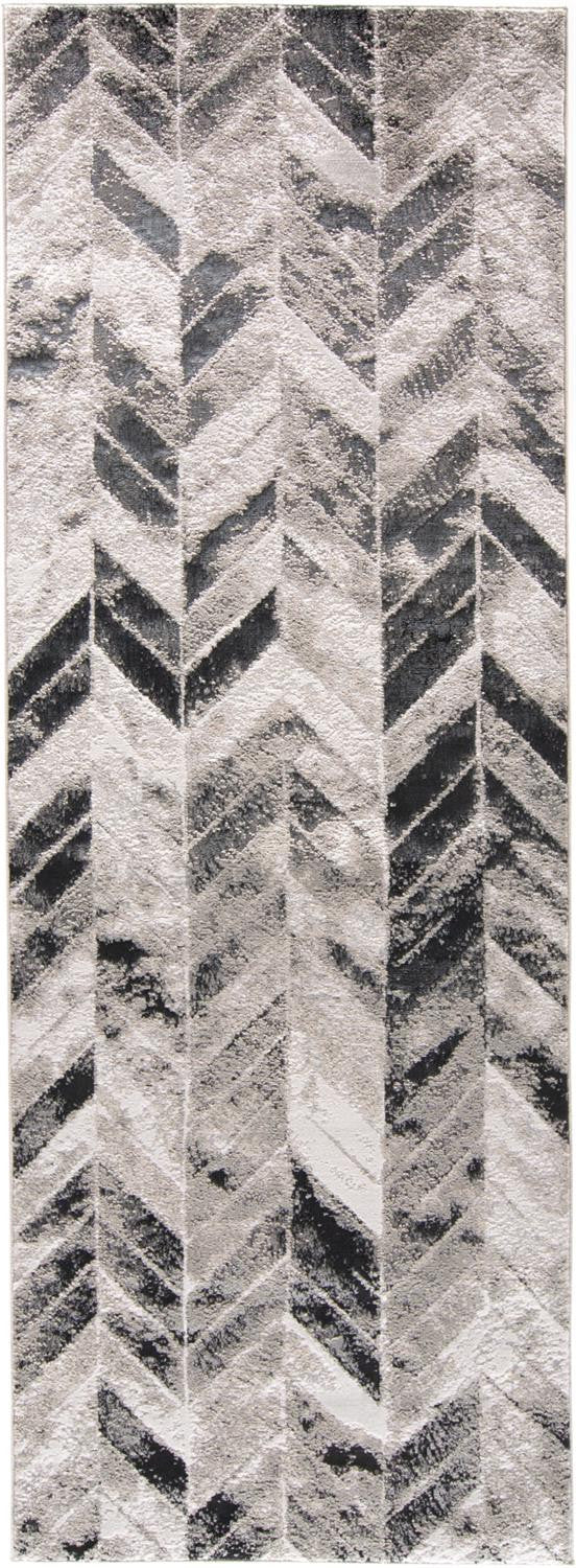 This 8-foot beige and black chevron runner rug, is a great way to add warmth to a room. This runner shaped rug features a chevron design that will add a functional and decorative accent to your space. Ideal for spaces with kids and pets, this rug is stain resistant to help repel dirt and spilled liquids. This smaller sized rug is just what you need for your walkway, or in front of door, cabinet, refrigerator, or chair. 34-inch h x 94-inch w x 0.39-inch d