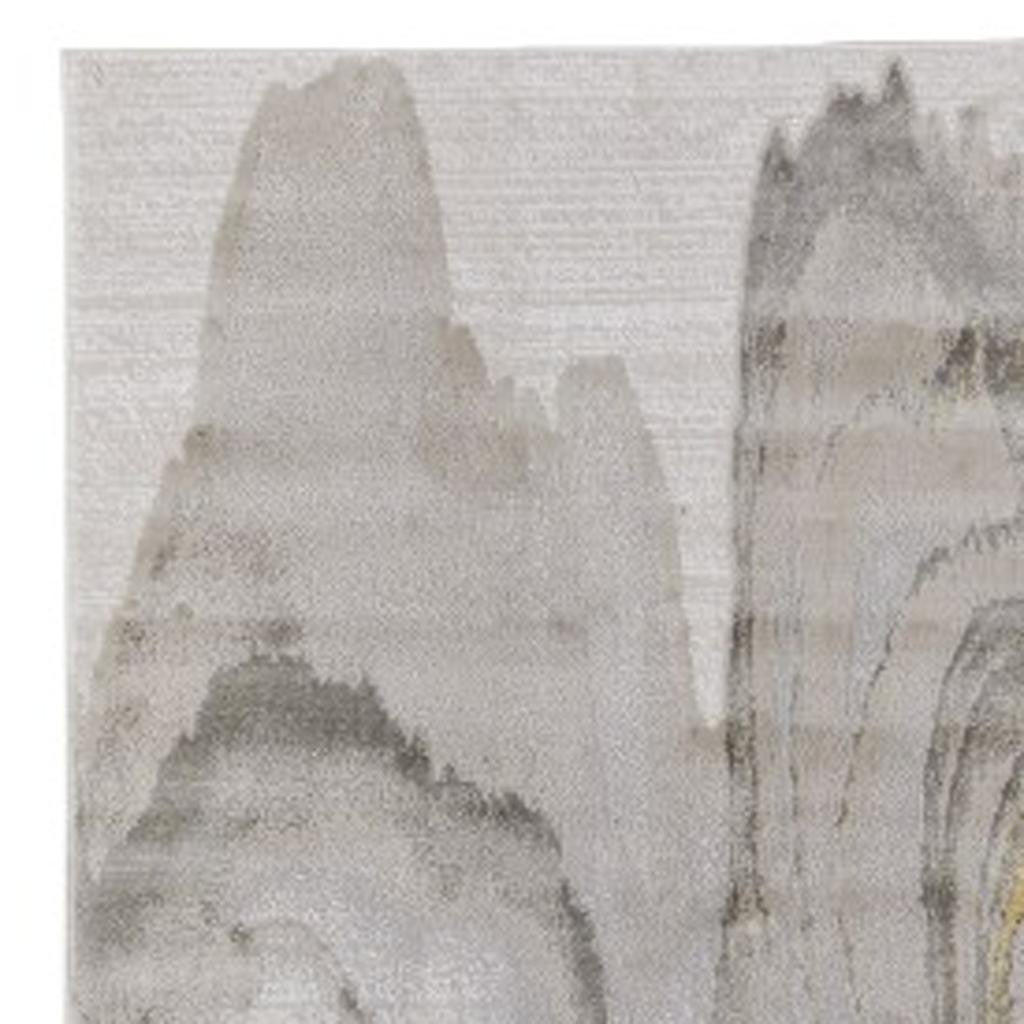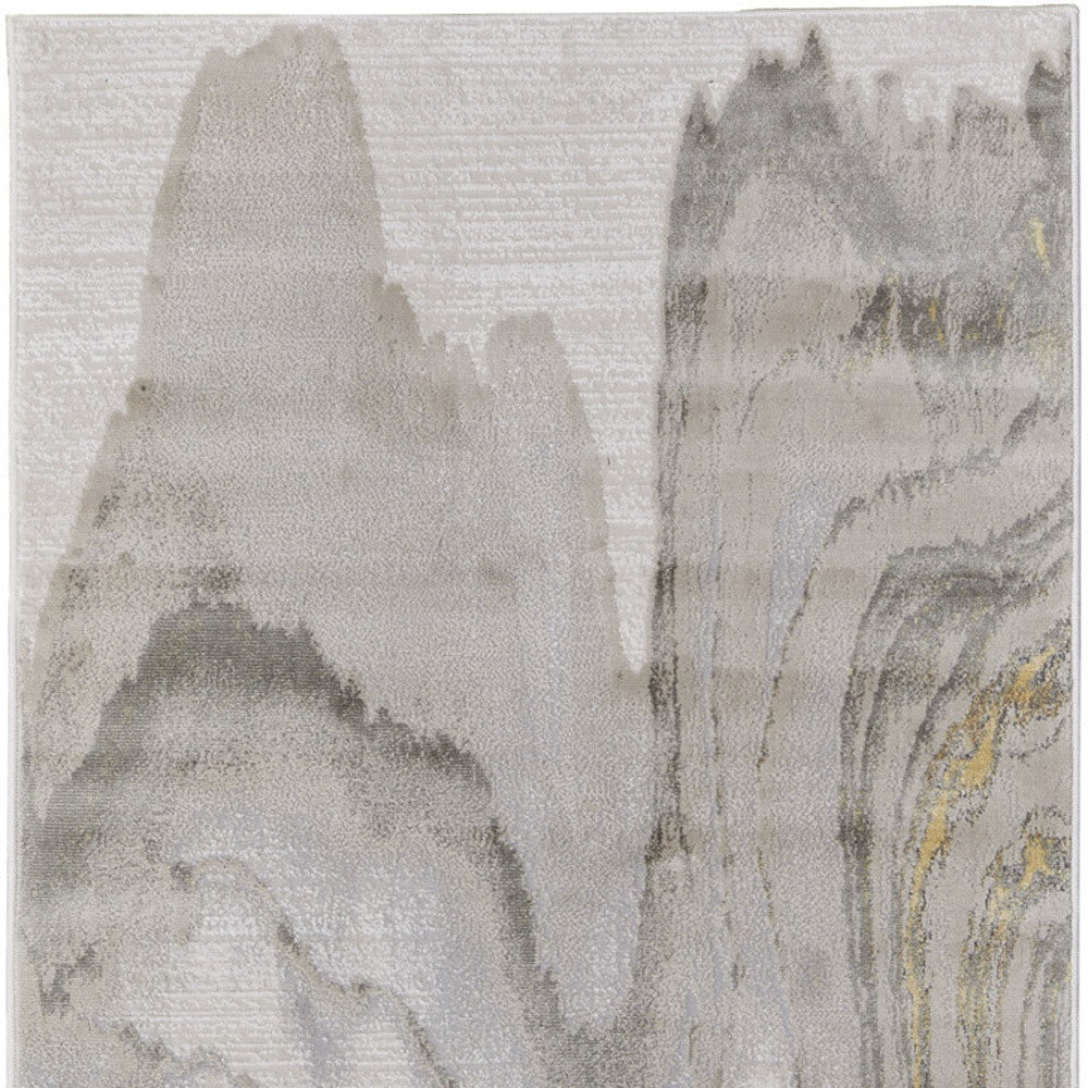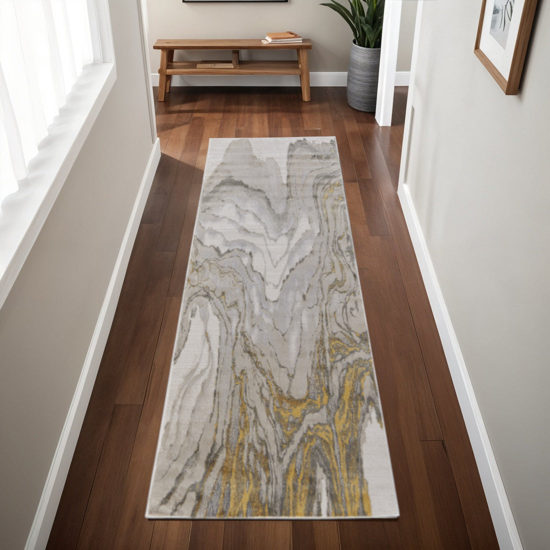 Set an inviting tone in your space with this 8-foot gold and ivory abstract runner rug. This runner shaped rug features a abstract design that will add a functional and decorative accent to your space. Ideal for spaces with kids and pets, this rug is stain resistant to help repel dirt and spilled liquids. This smaller sized rug is just what you need for your walkway, or in front of door, cabinet, refrigerator, or chair. 34-inch h x 94-inch w x 0.39-inch d