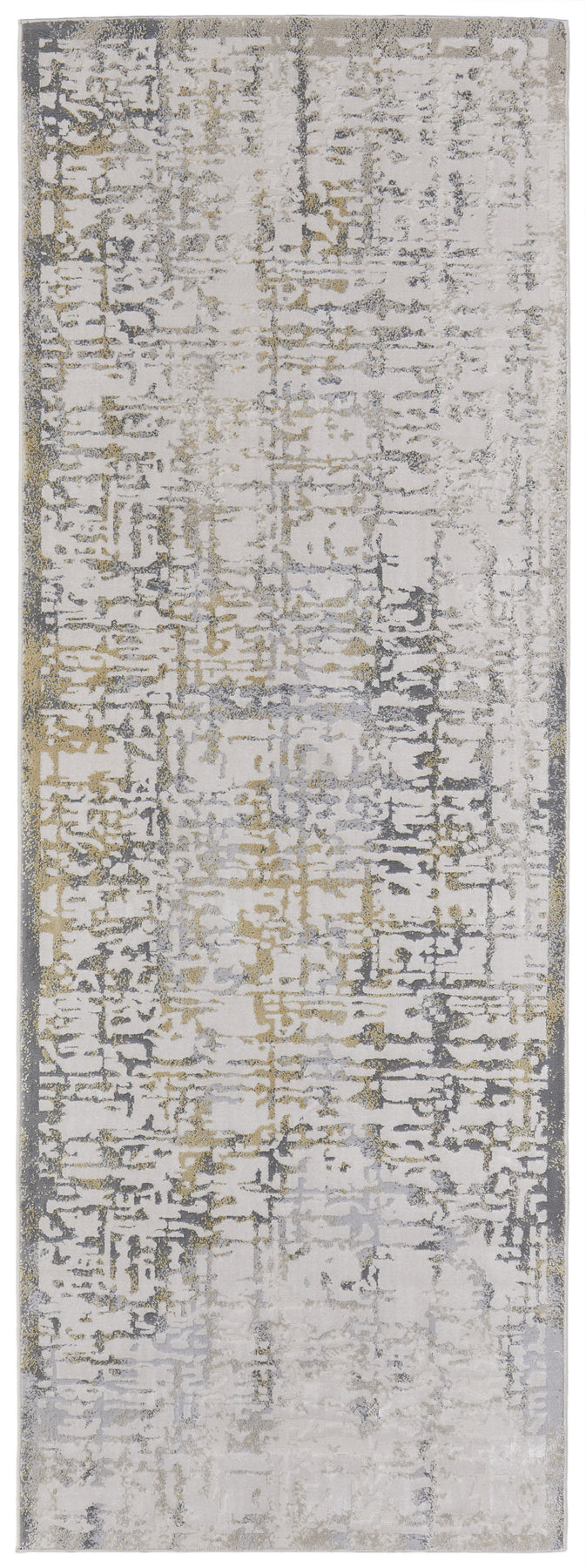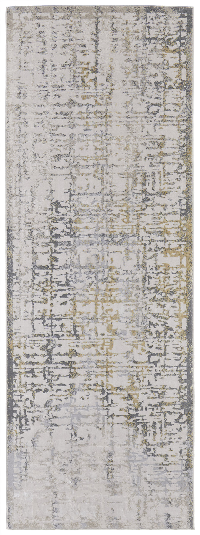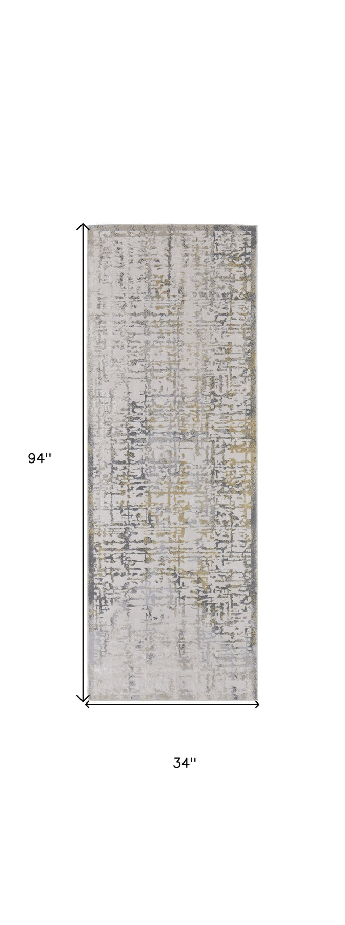 This 8-foot ivory and gray abstract distressed runner rug, is a great way to add warmth to a room. This runner shaped rug features a abstract design that will add a functional and decorative accent to your space. Ideal for spaces with kids and pets, this rug is stain resistant to help repel dirt and spilled liquids. This smaller sized rug is just what you need for your walkway, or in front of door, cabinet, refrigerator, or chair. 34-inch h x 94-inch w x 0.39-inch d