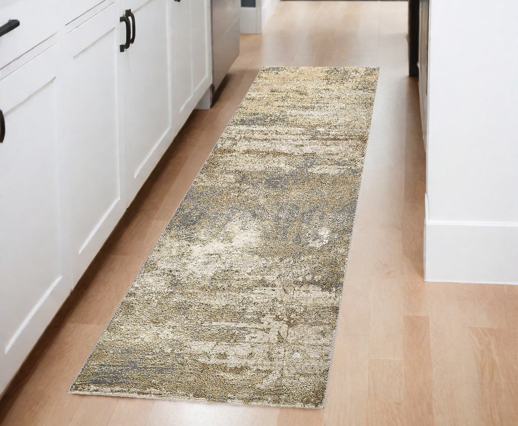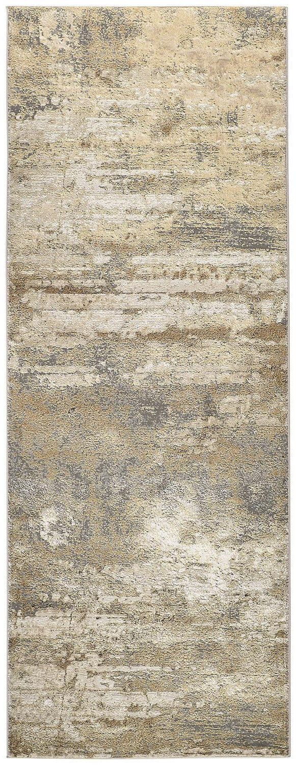 Add great coloration and comfortable texture to your space with this 8-foot gold and ivory abstract power loom runner rug. This runner shaped rug features a abstract design that will add a functional and decorative accent to your space. Ideal for spaces with kids and pets, this rug is stain resistant to help repel dirt and spilled liquids. This smaller sized rug is just what you need for your walkway, or in front of door, cabinet, refrigerator, or chair. 34-inch h x 94-inch w x 0.39-inch d