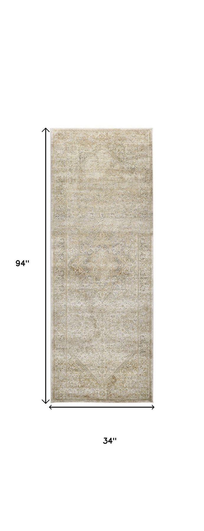 Set an inviting tone in your space with this 8-foot gold and ivory medallion power loom runner rug. This runner shaped rug features a medallion design that will add a functional and decorative accent to your space. Ideal for spaces with kids and pets, this rug is stain resistant to help repel dirt and spilled liquids. This smaller sized rug is just what you need for your walkway, or in front of door, cabinet, refrigerator, or chair. 34-inch h x 94-inch w x 0.39-inch d