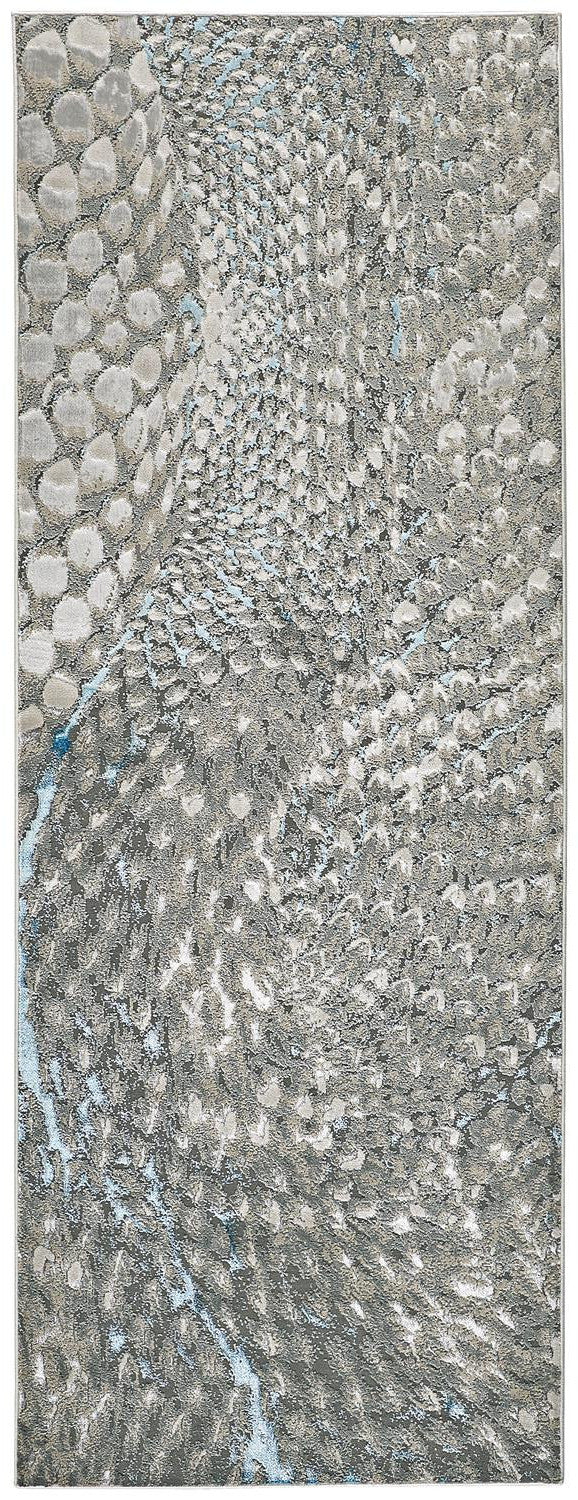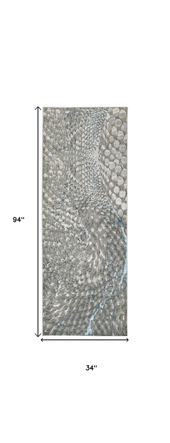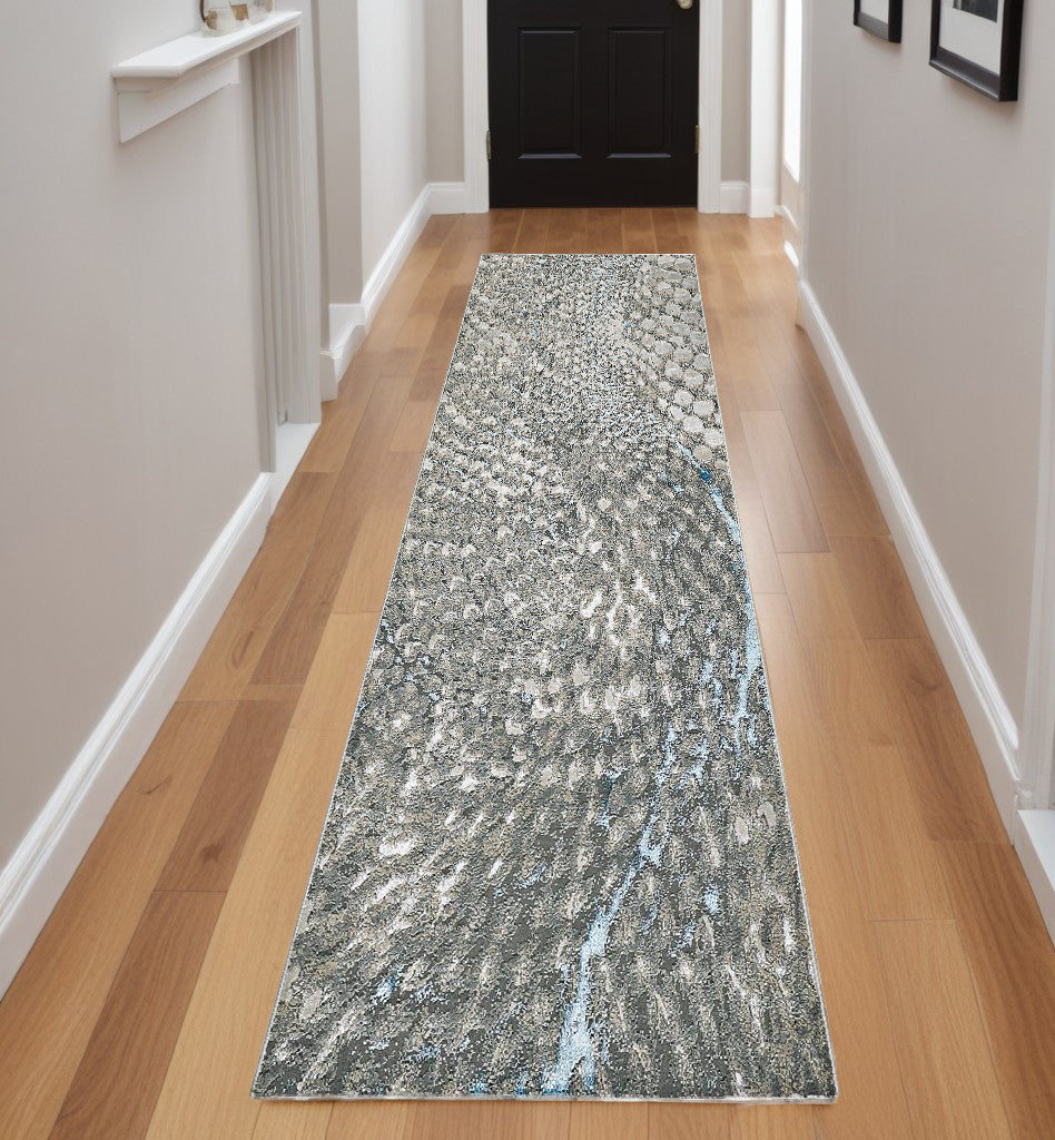 Set an inviting tone in your space with this 8-foot blue and gray abstract power loom runner rug. This runner shaped rug features a abstract design that will add a functional and decorative accent to your space. Ideal for spaces with kids and pets, this rug is stain resistant to help repel dirt and spilled liquids. This smaller sized rug is just what you need for your walkway, or in front of door, cabinet, refrigerator, or chair. 34-inch h x 94-inch w x 0.39-inch d