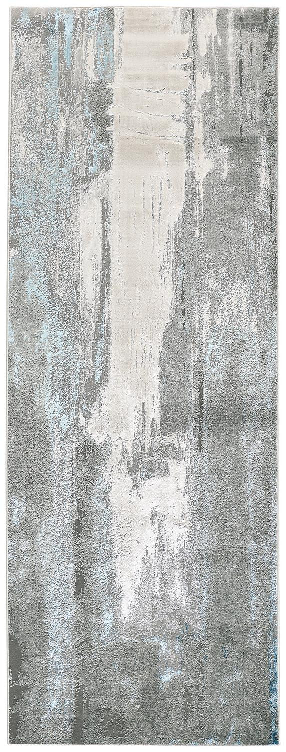 Add some artistry to your room with this 8-foot blue and gray abstract power loom runner rug. This runner shaped rug features a abstract design that will add a functional and decorative accent to your space. Ideal for spaces with kids and pets, this rug is stain resistant to help repel dirt and spilled liquids. This smaller sized rug is just what you need for your walkway, or in front of door, cabinet, refrigerator, or chair. 34-inch h x 94-inch w x 0.39-inch d