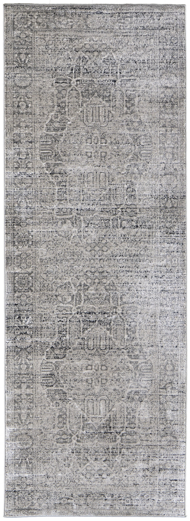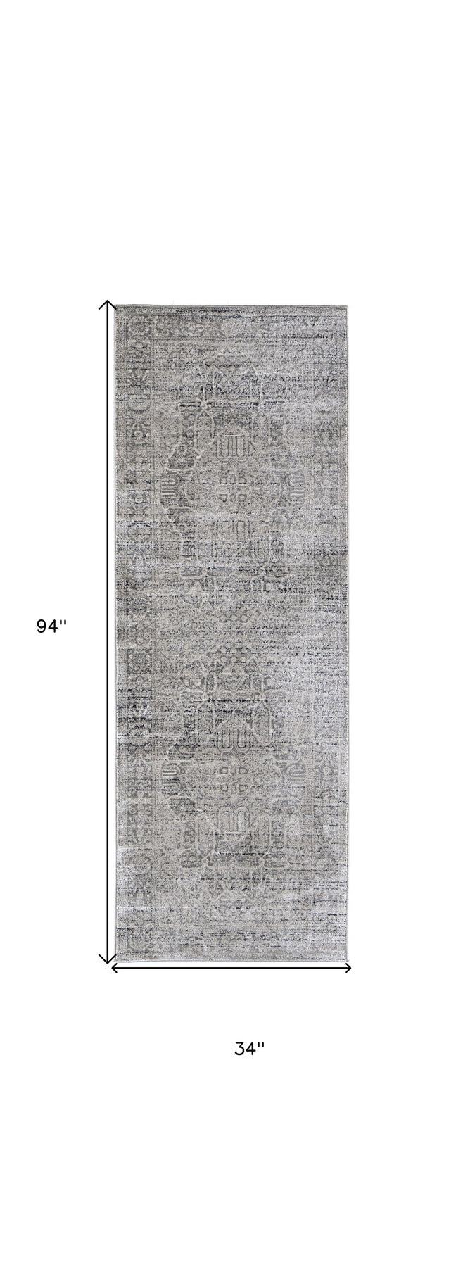 Add great coloration and comfortable texture to your space with this 8-foot gray and ivory floral power loom distressed non skid runner rug. This runner shaped rug features a floral design in gray and ivory to give it visual interest. A classic shape marries with good looking design for your space. 34-inch H x 94-inch W x 0.39-inch D