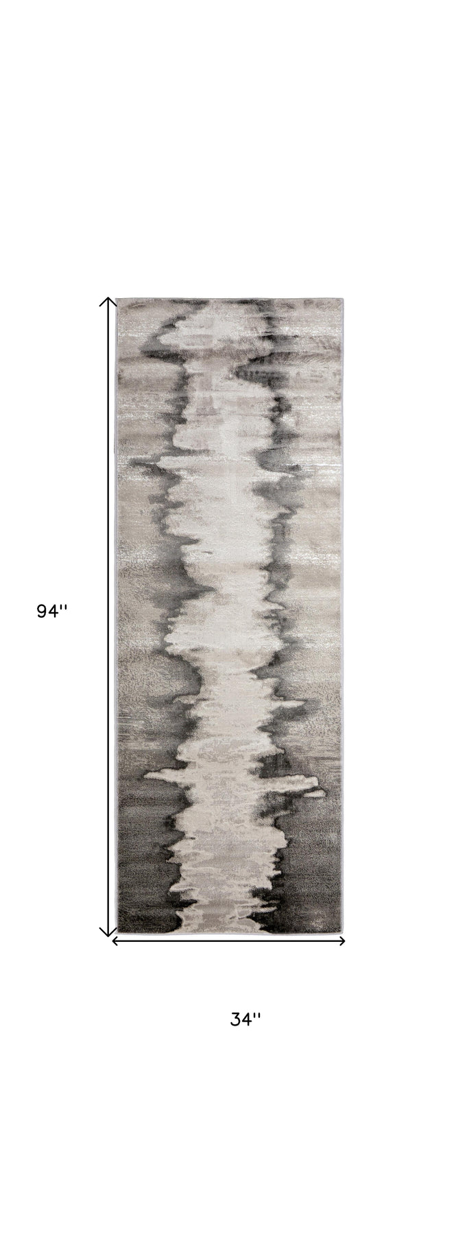 Set an inviting tone in your space with this 8-foot gray ivory and taupe abstract power loom runner rug. This runner shaped rug features a abstract design that will add a functional and decorative accent to your space. Ideal for spaces with kids and pets, this rug is stain resistant to help repel dirt and spilled liquids. This smaller sized rug is just what you need for your walkway, or in front of door, cabinet, refrigerator, or chair. 34-inch h x 94-inch w x 0.39-inch d