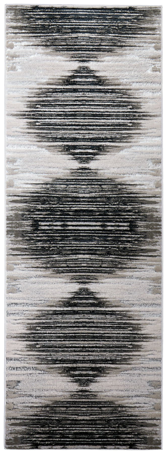Add some artistry to your room with this 8-foot black and silver geometric power loom runner rug. This runner shaped rug features a geometric design that will add a functional and decorative accent to your space. Ideal for spaces with kids and pets, this rug is stain resistant to help repel dirt and spilled liquids. This smaller sized rug is just what you need for your walkway, or in front of door, cabinet, refrigerator, or chair. 34-inch h x 94-inch w x 0.39-inch d