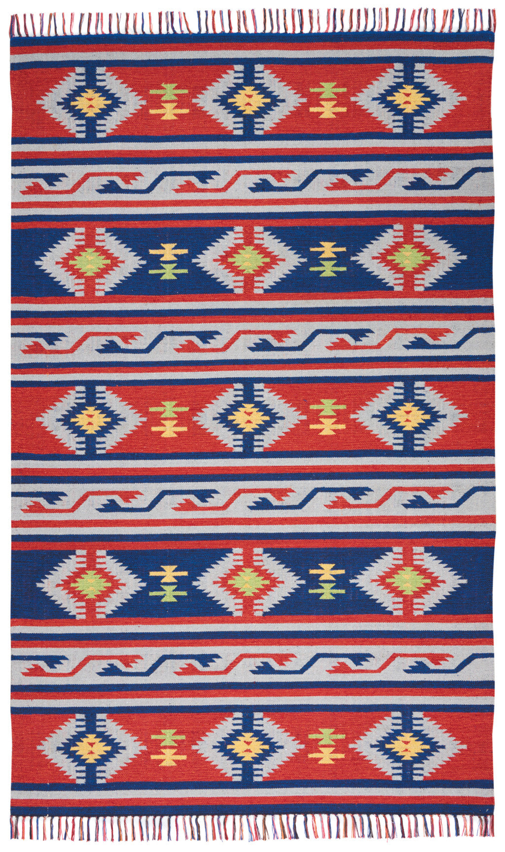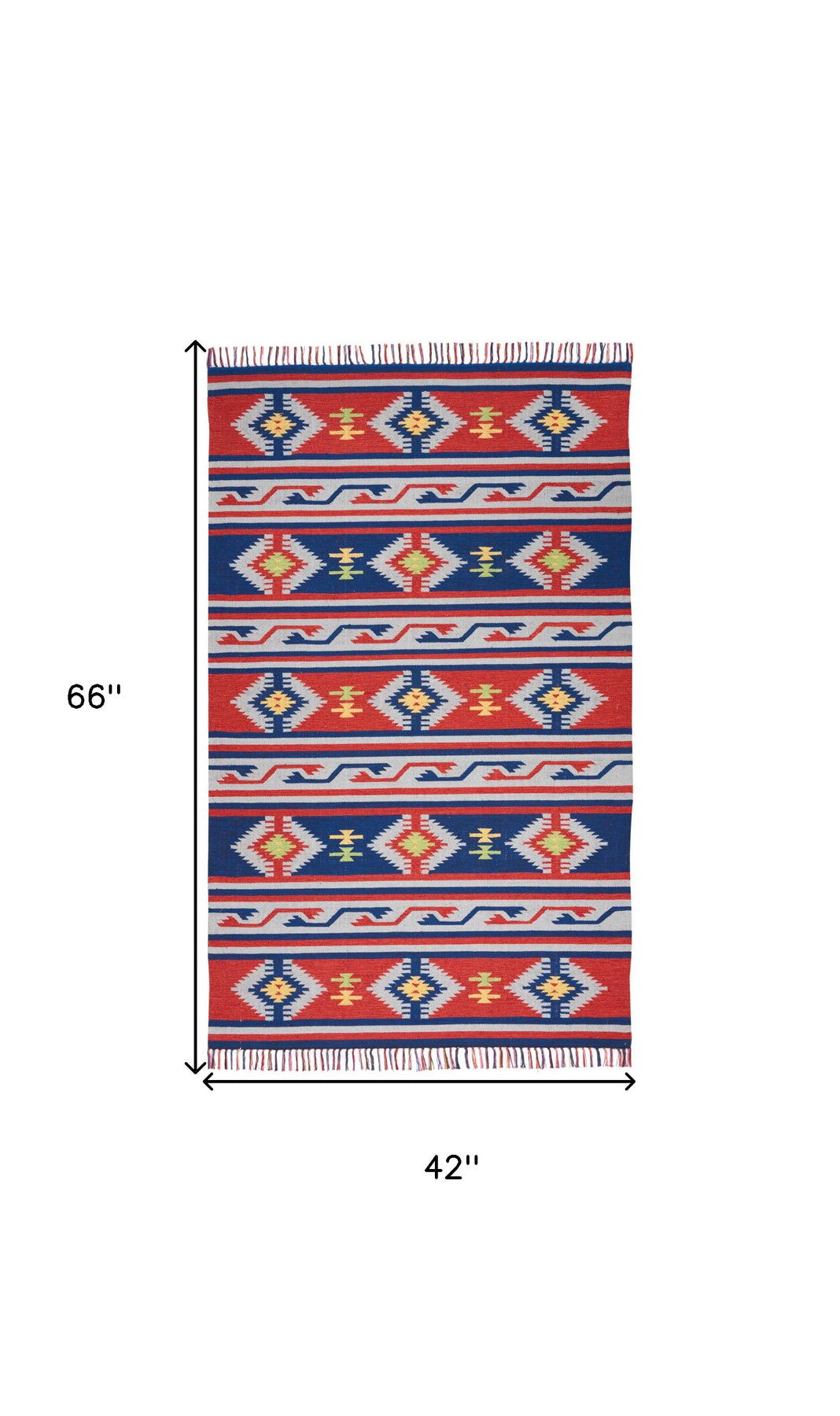 Add some artistry to your room with this 4-foot x 6-foot blue and red southwestern handmade area rug with fringe. This rectangle shaped rug features a southwestern design that will add a functional and decorative accent to your space. Tassel ends bring a timeless and fashionable look to your interior. This smaller sized rug is just what you need for your walkway, or in front of door, cabinet, refrigerator, or chair. 42-inch h x 66-inch w x 0.25-inch d