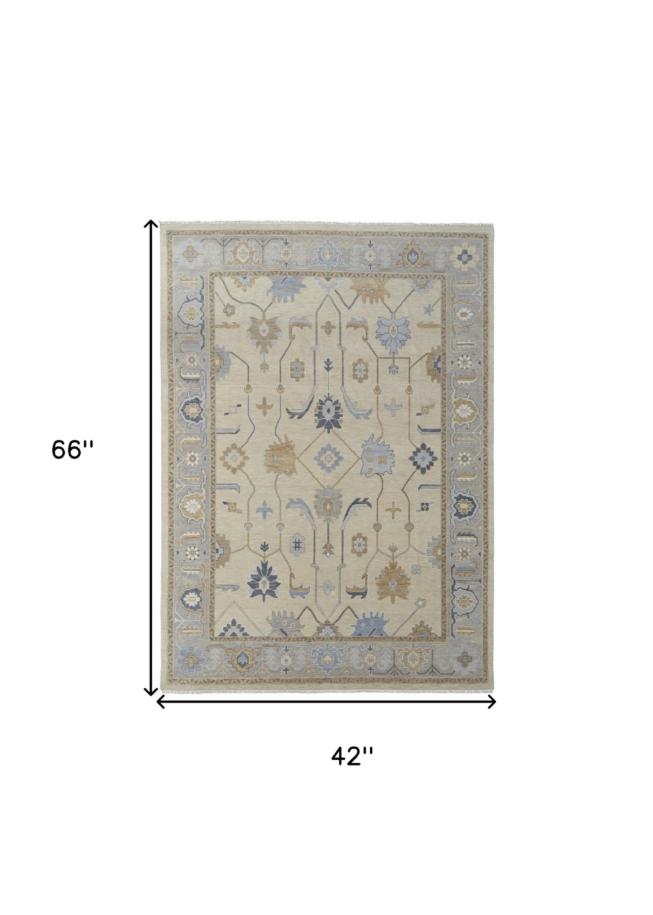 Set an inviting tone in your space with this 4-foot x 6-foot gray ivory and blue wool floral hand knotted area rug with fringe. This rectangle shaped rug features a floral design in gray ivory and blue to give it visual interest. A classic shape marries with good looking design for your space ideal for spaces with kids and pets, this rug is stain resistant to help repel stains and spilled liquids. Tassel ends bring a timeless and fashionable look to your interior. Crafted by skilled artisans, this hand knotted rug is genuine and unique. No two will be exactly alike. 42-inch H x 66-inch W x 0.2-inch D