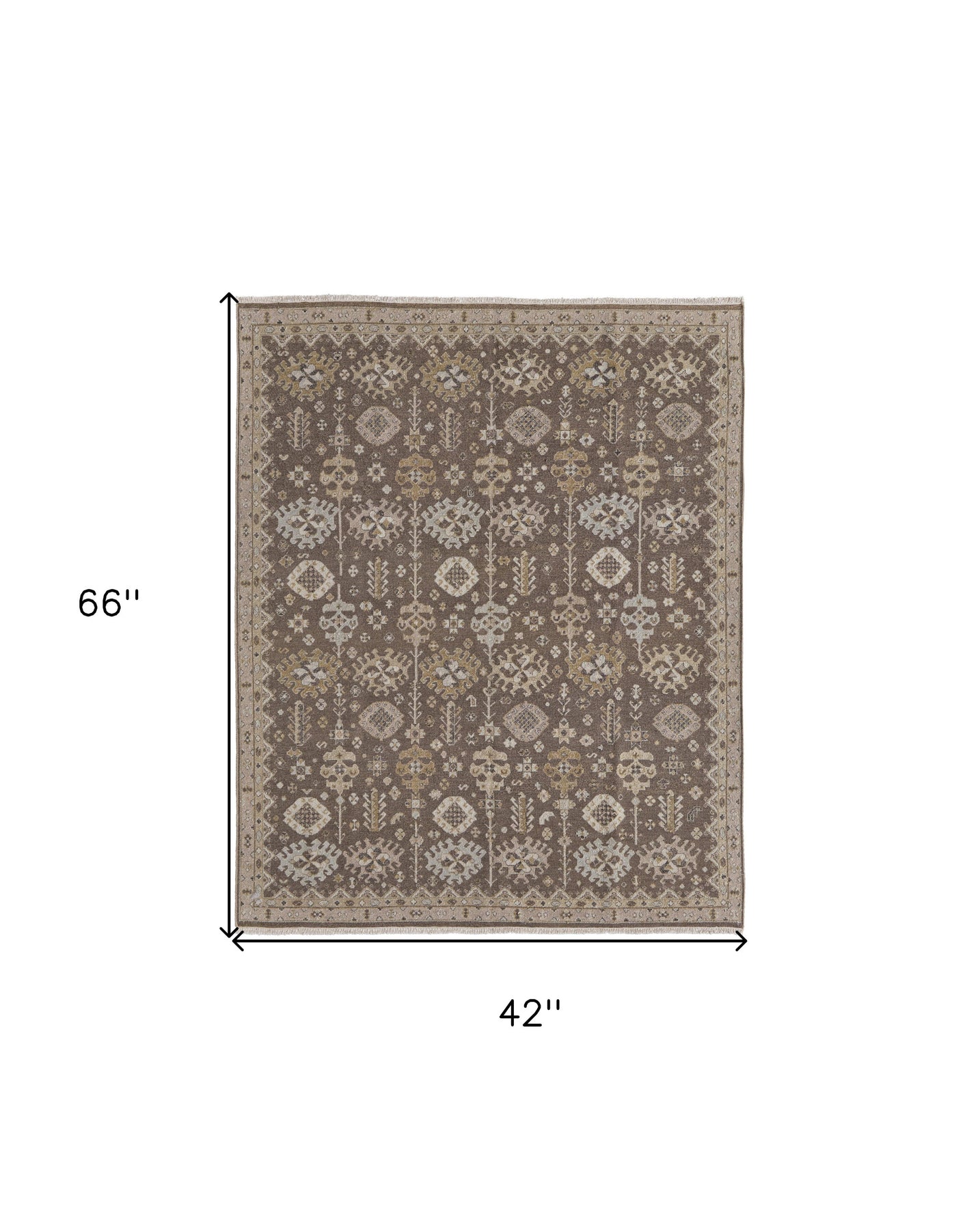 Add some artistry to your room with this 4-foot x 6-foot tan and brown wool oriental hand knotted area rug with fringe. This rectangle shaped rug features a oriental design in tan and brown to give it visual interest. A classic shape marries with good looking design for your space ideal for spaces with kids and pets, this rug is stain resistant to help repel stains and spilled liquids. Tassel ends bring a timeless and fashionable look to your interior. Crafted by skilled artisans, this hand knotted rug is genuine and unique. No two will be exactly alike. Area rugs help to give warmth and sense of home to your space. 42-inch H x 66-inch W x 0.2-inch D