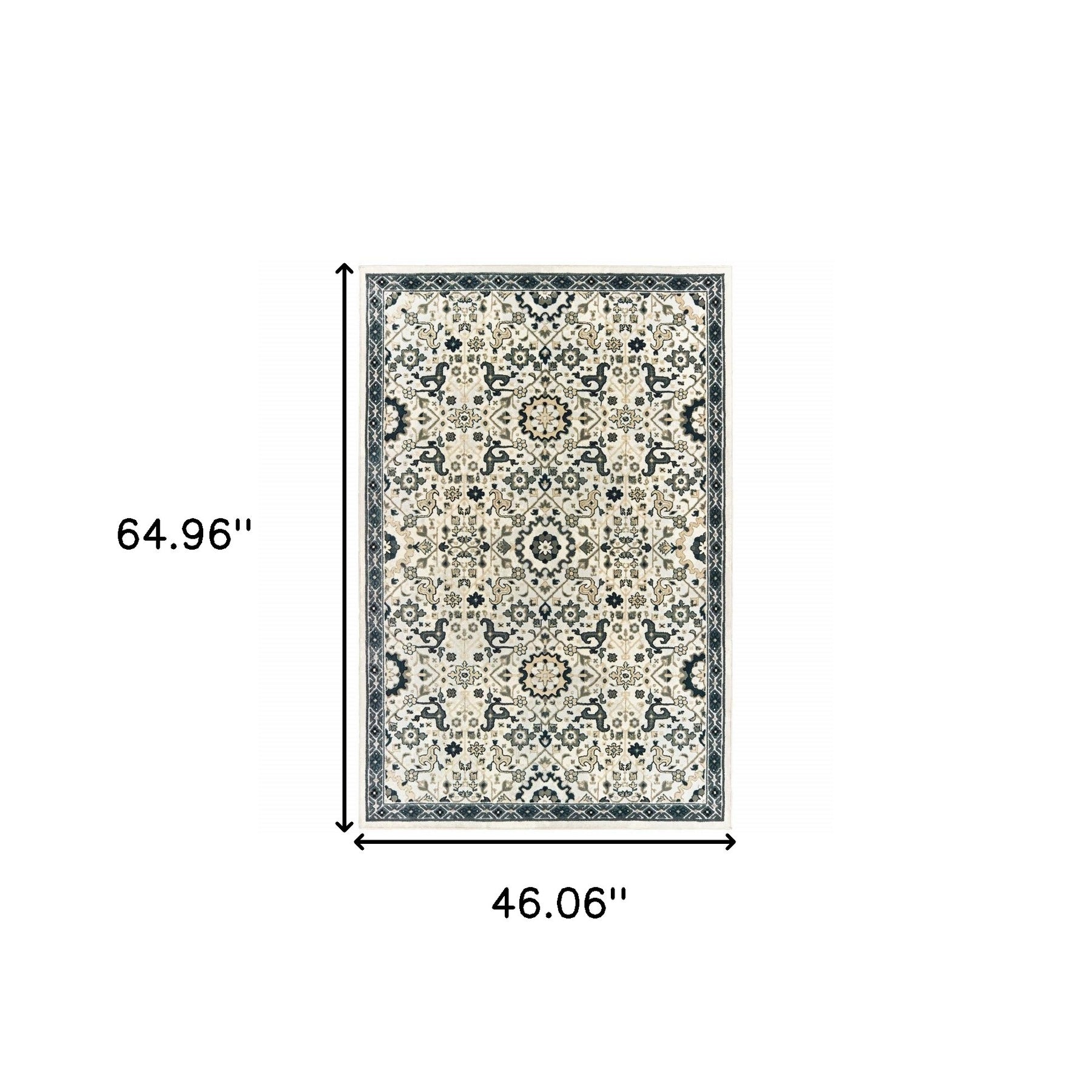 Set an inviting tone in your space with this 4' x 6' ivory navy and gold oriental power loom stain resistant area rug. This rectangle shaped rug features a oriental design in ivory navy and gold to give it visual interest. A classic shape marries with good looking design for your space Ideal for spaces with kids and pets, this rug is stain resistant to help repel stains and spilled liquids. Area Rugs help to give warmth and sense of home to your space. 0.39" H x 46.06" W x 64.96" D