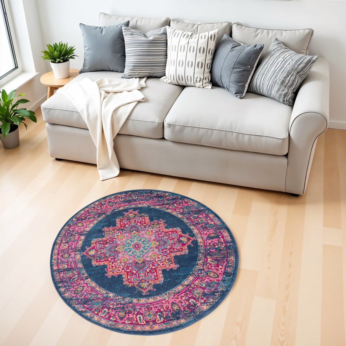 Add some artistry to your room with this 4-foot blue and pink medallion distressed round rug. Built to last, this rug crafted from polypropylene fibers is known for its durability and long lasting appeal. Rugs are a great way to showcase your style, hide imperfections, warm your home and reduce noise. This geometric round shaped rug features a medallion pattern in blue and pink that combines a good looking print with a unique and updated shape. The mix of shape, color, and design gives this rug refreshing visual interest. This smaller sized, transitional styled rug is just what you need for your walkway, bedside, in front of door, cabinet, refrigerator, or chair. 48-inch h x 48-inch w x 0.5-inch d.