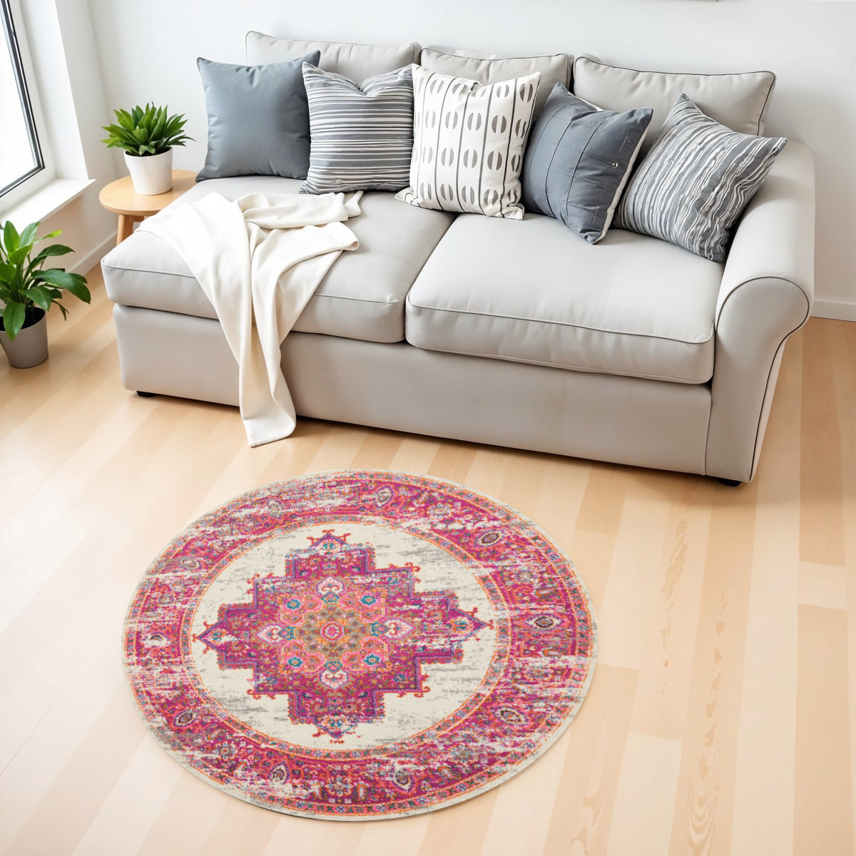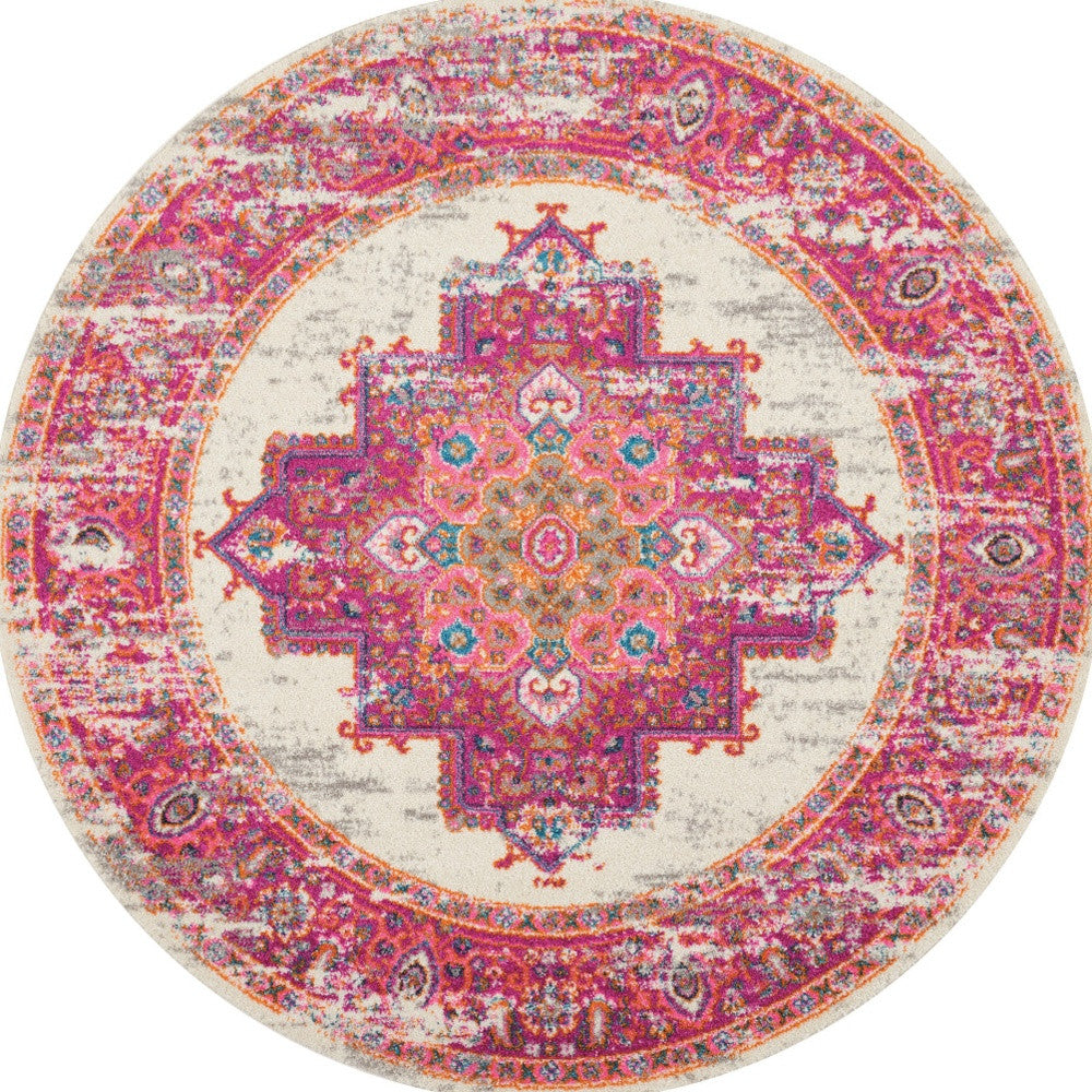 Add some artistry to your room with this 4-foot ivory and fuchsia oriental distressed round rug. Built to last, this rug crafted from polypropylene fibers is known for its durability and long lasting appeal. Rugs are a great way to showcase your style, hide imperfections, warm your home and reduce noise. This geometric round shaped rug features a oriental pattern in ivory and fuchsia that combines a good looking print with a unique and updated shape. The mix of shape, color, and design gives this rug refreshing visual interest. This smaller sized, transitional styled rug is just what you need for your walkway, bedside, in front of door, cabinet, refrigerator, or chair. 48-inch h x 48-inch w x 0.5-inch d.