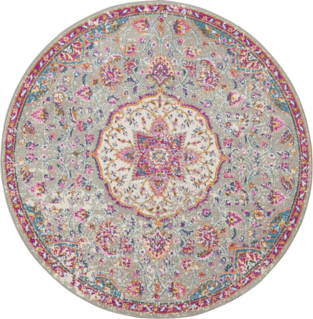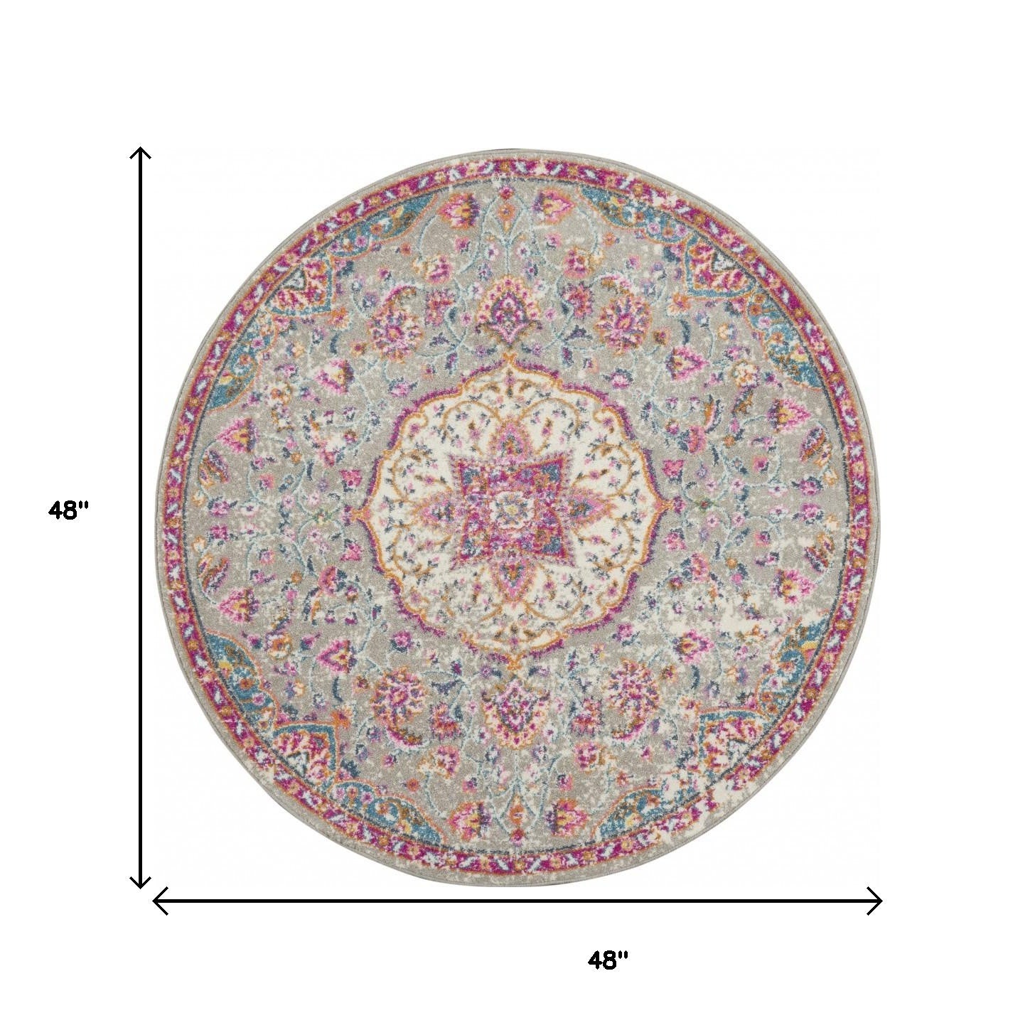 This 4-foot gray and ivory medallion round rug, is a great way to add warmth to a room. Built to last, this rug crafted from polypropylene fibers is known for its durability and long lasting appeal. Rugs are a great way to showcase your style, hide imperfections, warm your home and reduce noise. This geometric round shaped rug features a medallion pattern in gray and ivory that combines a good looking print with a unique and updated shape. The mix of shape, color, and design gives this rug refreshing visual interest. This smaller sized, traditional styled rug is just what you need for your walkway, bedside, in front of door, cabinet, refrigerator, or chair. 48-inch h x 48-inch w x 0.5-inch d.