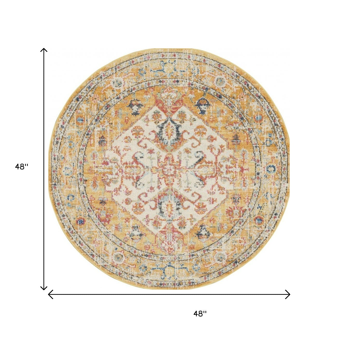 Set an inviting tone in your space with this 4-foot yellow and ivory medallion round rug. Built to last, this rug crafted from polypropylene fibers is known for its durability and long lasting appeal. Rugs are a great way to showcase your style, hide imperfections, warm your home and reduce noise. This geometric round shaped rug features a medallion pattern in yellow and ivory that combines a good looking print with a unique and updated shape. The mix of shape, color, and design gives this rug refreshing visual interest. This smaller sized, transitional styled rug is just what you need for your walkway, bedside, in front of door, cabinet, refrigerator, or chair. 48-inch h x 48-inch w x 0.5-inch d.