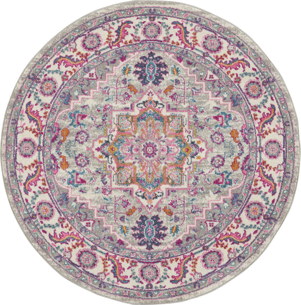 Set an inviting tone in your space with this 4' gray round floral power loom area rug. This geometric round shaped rug features a floral pattern in gray that combines a good looking print with a unique and updated shape. The mix of shape, color, and design gives this rug refreshing visual interest. Made in Turkey, this rug offers high quality combined with good looking designer sensibilities. Place this area rug against a hardwood or tile floor and it will enliven your living space with style and sophistication. .50" H x 48.00" W x 48.00" D