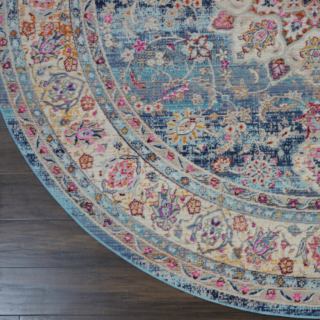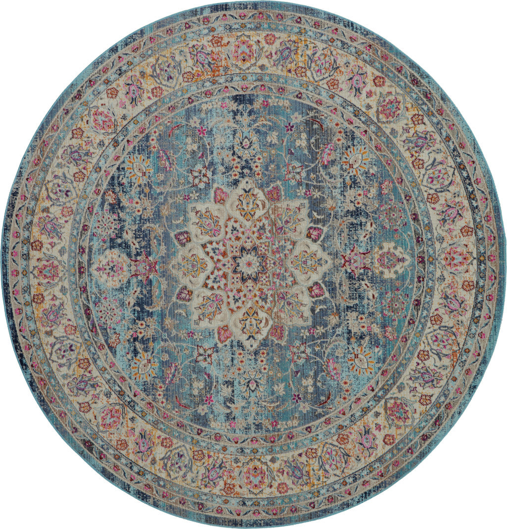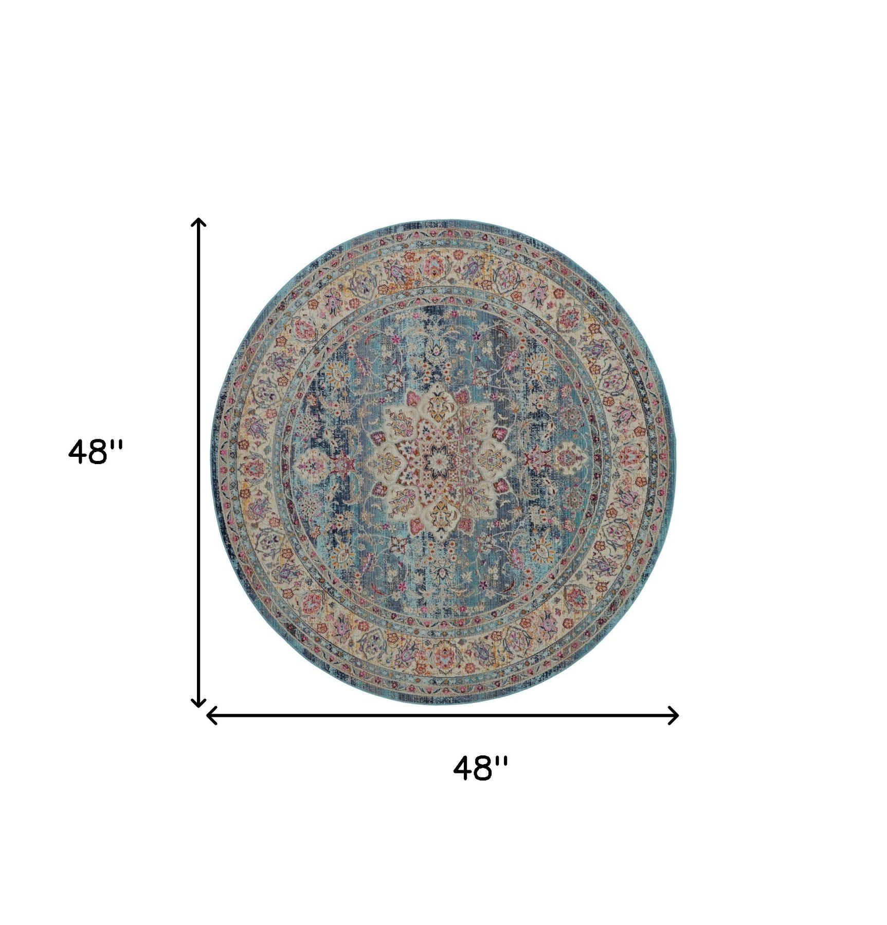 This 4-foot blue and beige floral distressed round rug, is a great way to add warmth to a room. Ideal for spaces with kids and pets, this rug is stain resistant to help repel dirt and spilled liquids. Built to last, this rug crafted from polypropylene fibers is known for its durability and long lasting appeal. Rugs are a great way to showcase your style, hide imperfections, warm your home and reduce noise. This geometric round shaped rug features a floral pattern in blue and beige that combines a good looking print with a unique and updated shape. The mix of shape, color, and design gives this rug refreshing visual interest. This smaller sized, transitional styled rug is just what you need for your walkway, bedside, in front of door, cabinet, refrigerator, or chair. 48-inch h x 48-inch w x 0.5-inch d.