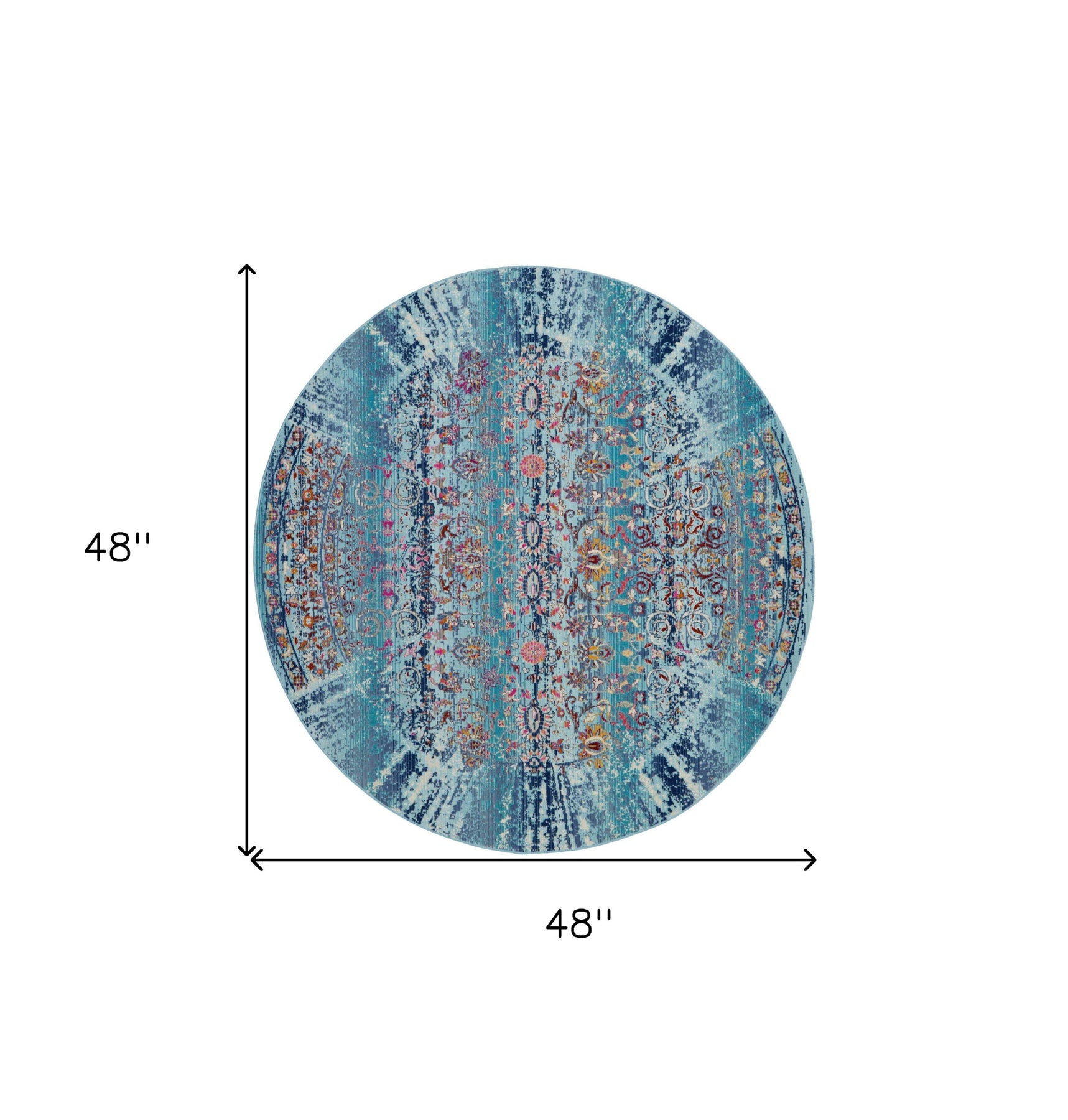Add some artistry to your room with this 4-foot blue red and orange floral distressed round rug. Ideal for spaces with kids and pets, this rug is stain resistant to help repel dirt and spilled liquids. Built to last, this rug crafted from polypropylene fibers is known for its durability and long lasting appeal. Rugs are a great way to showcase your style, hide imperfections, warm your home and reduce noise. This geometric round shaped rug features a floral pattern in blue, red, and orange that combines a good looking print with a unique and updated shape. The mix of shape, color, and design gives this rug refreshing visual interest. This smaller sized, transitional styled rug is just what you need for your walkway, bedside, in front of door, cabinet, refrigerator, or chair. 48-inch h x 48-inch w x 0.5-inch d.