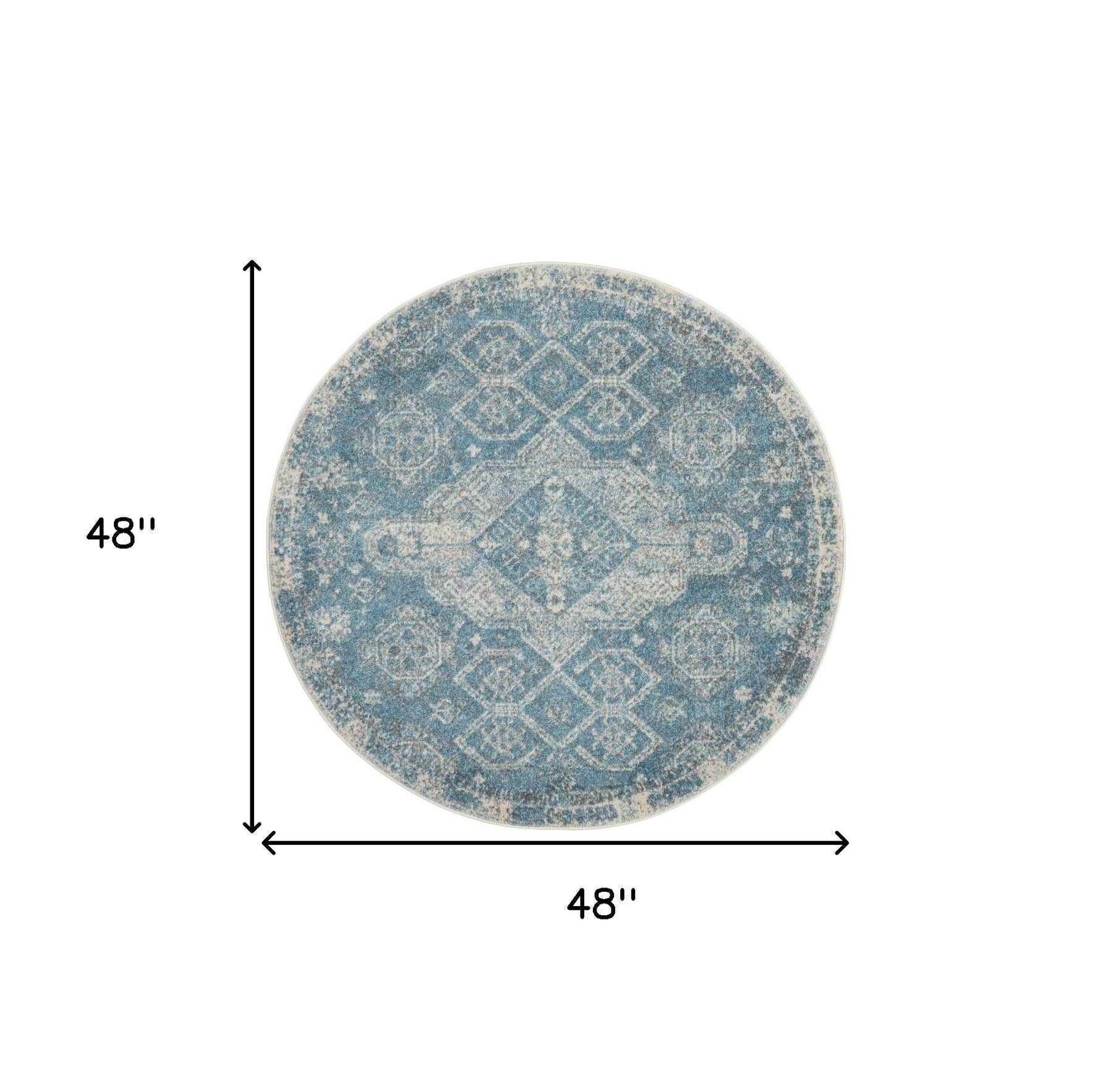 This 4-foot ivory and light blue oriental distressed round rug, is a great way to add warmth to a room. Ideal for spaces with kids and pets, this rug is stain resistant to help repel dirt and spilled liquids. Built to last, this rug crafted from polypropylene fibers is known for its durability and long lasting appeal. Rugs are a great way to showcase your style, hide imperfections, warm your home and reduce noise. This geometric round shaped rug features a oriental pattern in ivory and light blue that combines a good looking print with a unique and updated shape. The mix of shape, color, and design gives this rug refreshing visual interest. This smaller sized, transitional styled rug is just what you need for your walkway, bedside, in front of door, cabinet, refrigerator, or chair. 48-inch h x 48-inch w x 0.5-inch d.