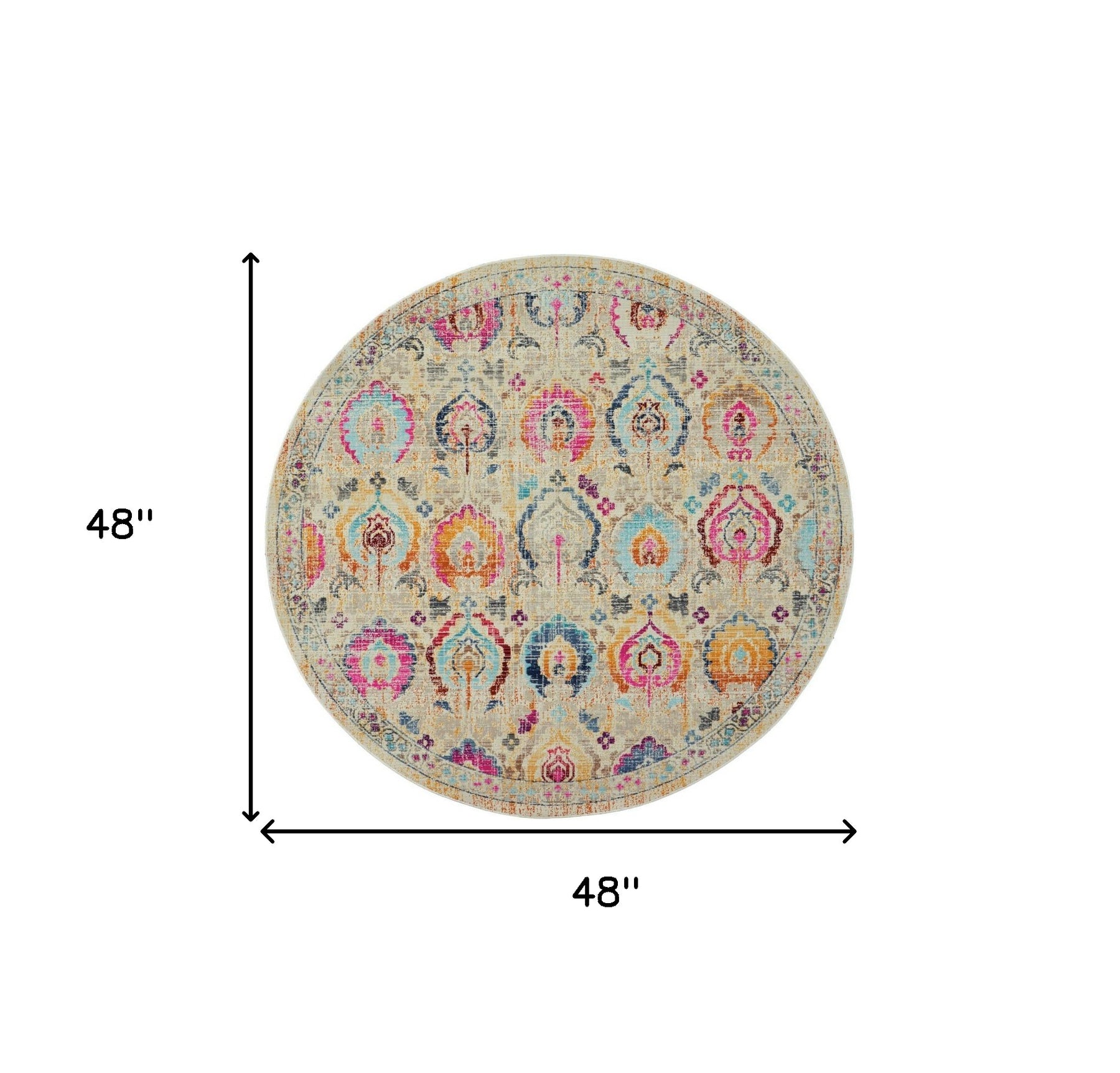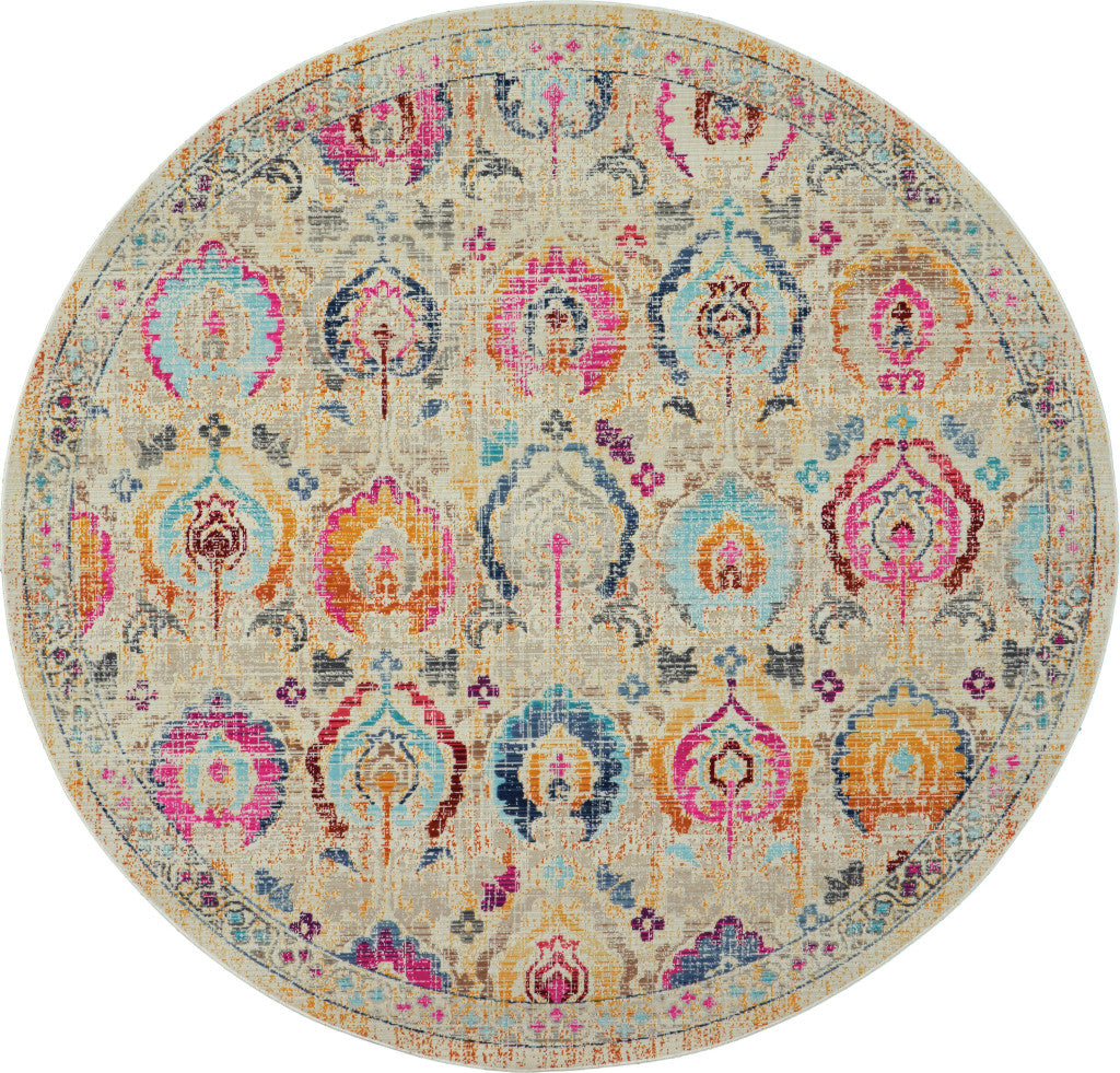 Add great coloration and comfortable texture to your space with this 4-foot ivory pink and orange floral distressed round rug. Ideal for spaces with kids and pets, this rug is stain resistant to help repel dirt and spilled liquids. Built to last, this rug crafted from polypropylene fibers is known for its durability and long lasting appeal. Rugs are a great way to showcase your style, hide imperfections, warm your home and reduce noise. This geometric round shaped rug features a floral pattern in ivory, pink, and orange that combines a good looking print with a unique and updated shape. The mix of shape, color, and design gives this rug refreshing visual interest. This smaller sized, transitional styled rug is just what you need for your walkway, bedside, in front of door, cabinet, refrigerator, or chair. 48-inch h x 48-inch w x 0.5-inch d.