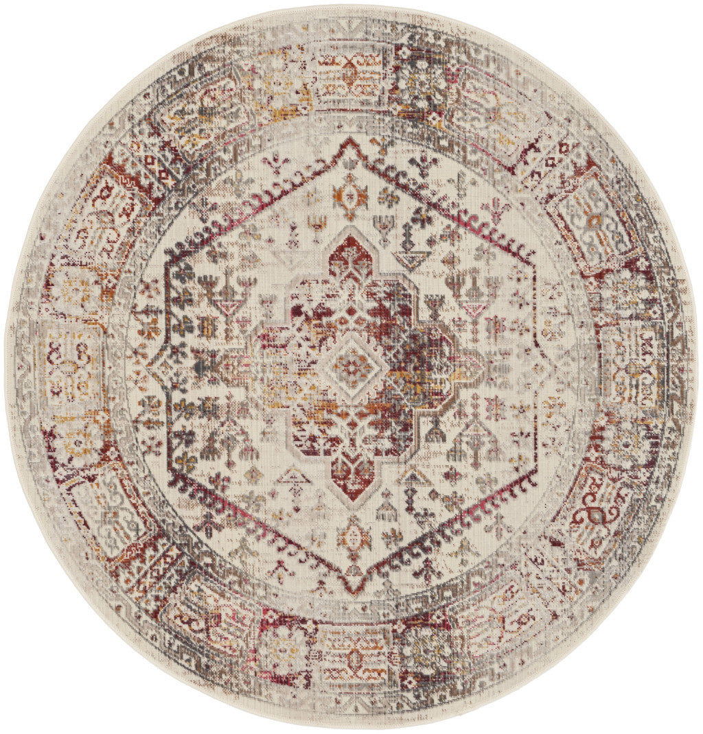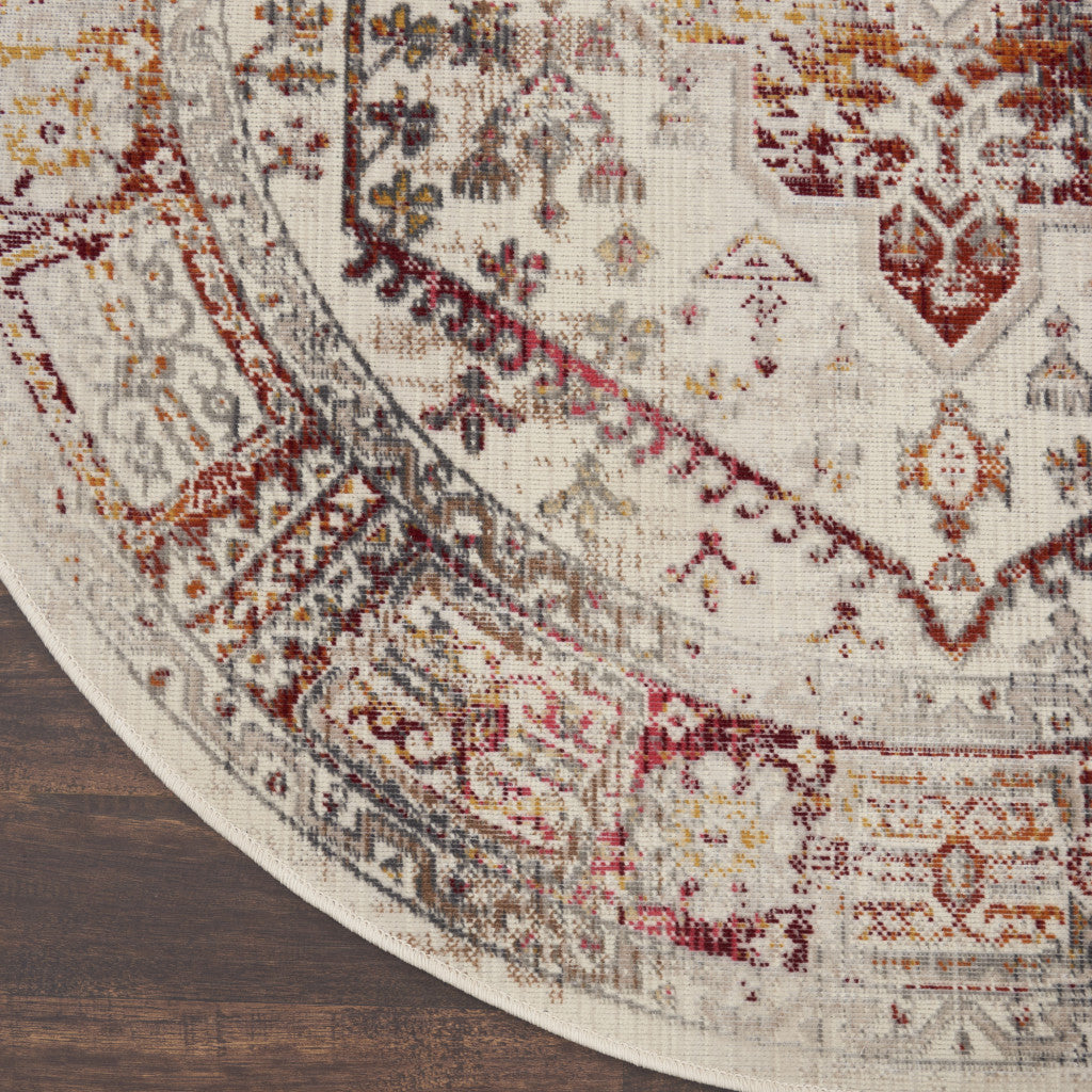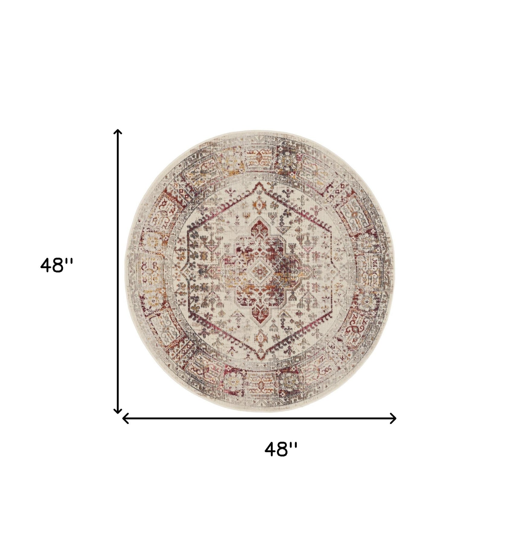 Set an inviting tone in your space with this 4-foot ivory red and orange floral distressed round rug. Ideal for spaces with kids and pets, this rug is stain resistant to help repel dirt and spilled liquids. Built to last, this rug crafted from polypropylene fibers is known for its durability and long lasting appeal. Rugs are a great way to showcase your style, hide imperfections, warm your home and reduce noise. This geometric round shaped rug features a floral pattern in ivory, red, and orange that combines a good looking print with a unique and updated shape. The mix of shape, color, and design gives this rug refreshing visual interest. This smaller sized, transitional styled rug is just what you need for your walkway, bedside, in front of door, cabinet, refrigerator, or chair. 48-inch h x 48-inch w x 0.5-inch d.