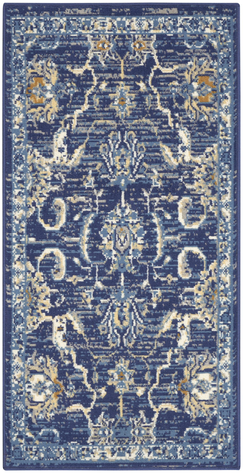 Set an inviting tone in your space with this 2-foot x 4-foot blue and gold oriental area rug. Built to last, this rug crafted from polypropylene fibers is known for its durability and long lasting appeal. Rugs are a great way to showcase your style, hide imperfections, warm your home and reduce noise. This smaller sized, traditional styled rug is just what you need for your walkway, bedside, in front of door, cabinet, refrigerator, or chair. 24-inch h x 48-inch w x 0.5-inch d.