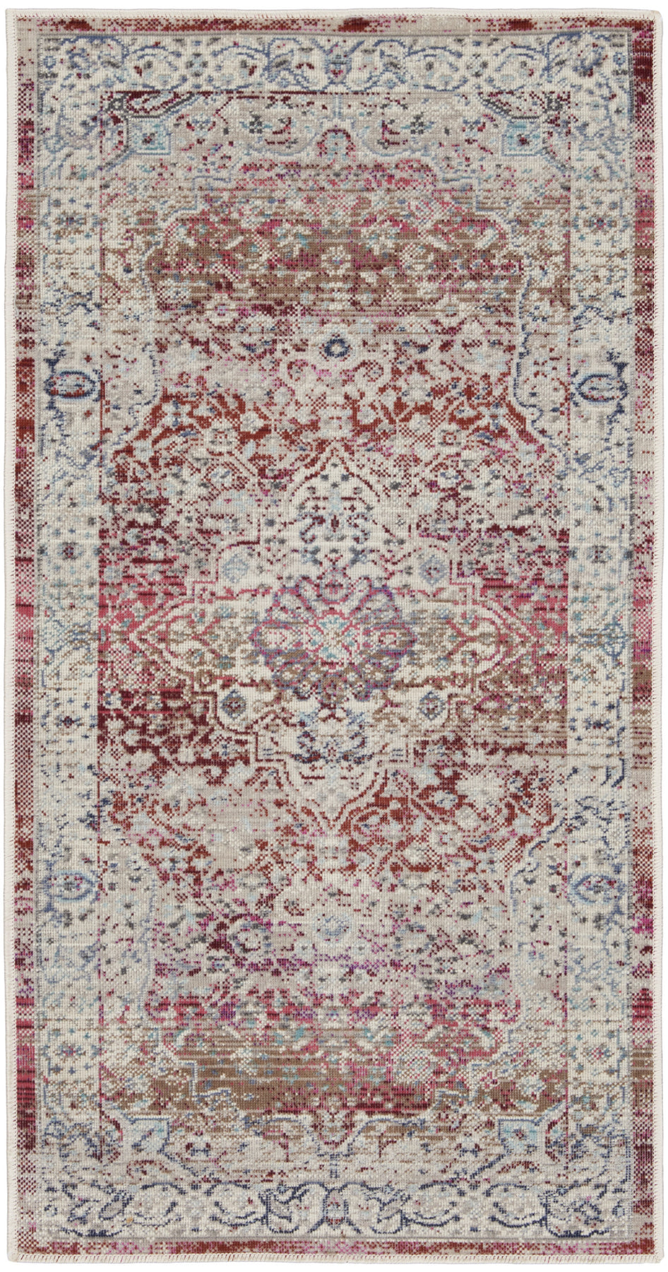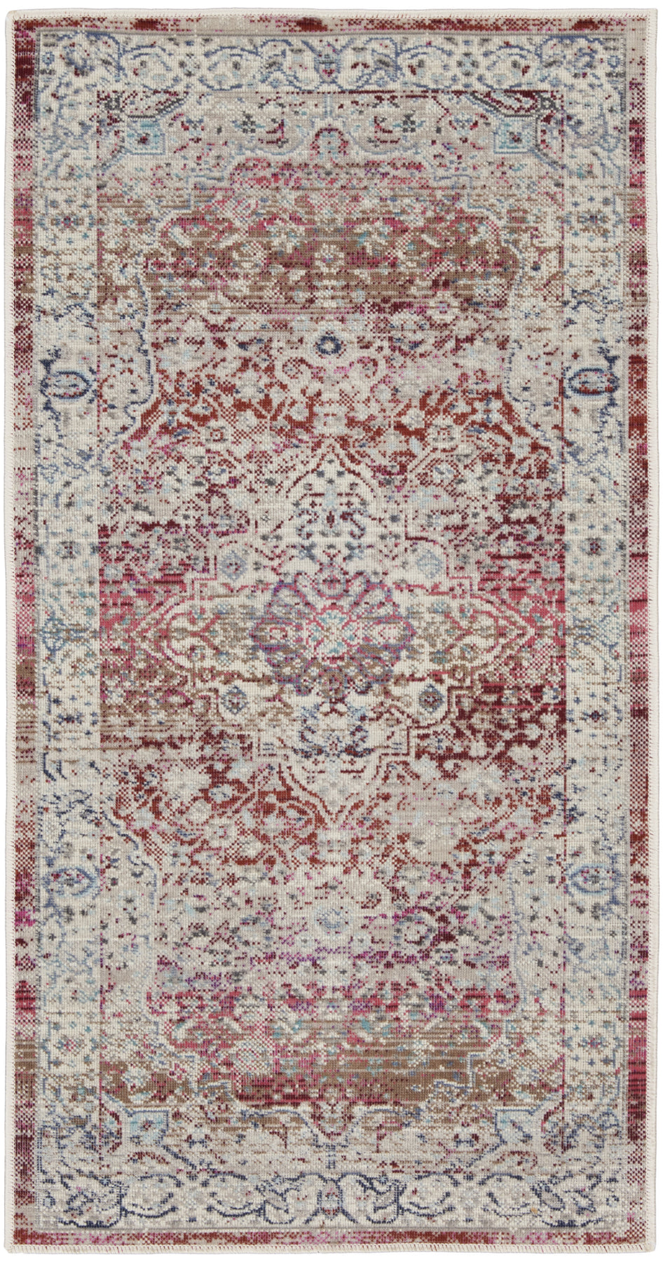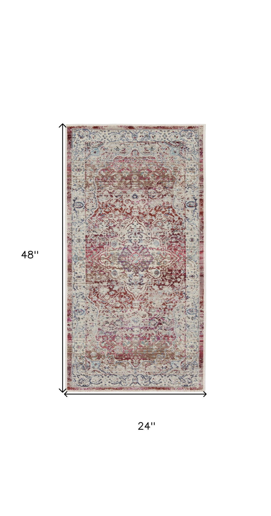 Set an inviting tone in your space with this 2-foot x 4-foot ivory red and brown floral distressed area rug. Ideal for spaces with kids and pets, this rug is stain resistant to help repel dirt and spilled liquids. Built to last, this rug crafted from polypropylene fibers is known for its durability and long lasting appeal. Rugs are a great way to showcase your style, hide imperfections, warm your home and reduce noise. This smaller sized, transitional styled rug is just what you need for your walkway, bedside, in front of door, cabinet, refrigerator, or chair. 24-inch h x 48-inch w x 0.5-inch d.