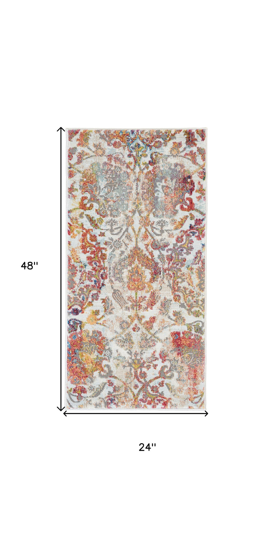 Set an inviting tone in your space with this 2-foot x 4-foot ivory gray and orange floral distressed non skid area rug. Ideal for spaces with kids and pets, this rug is stain resistant to help repel dirt and spilled liquids. Built to last, this rug crafted from polypropylene fibers is known for its durability and long lasting appeal. Rugs are a great way to showcase your style, hide imperfections, warm your home and reduce noise. This smaller sized, transitional styled rug is just what you need for your walkway, bedside, in front of door, cabinet, refrigerator, or chair. 24-inch h x 48-inch w x 0.5-inch d