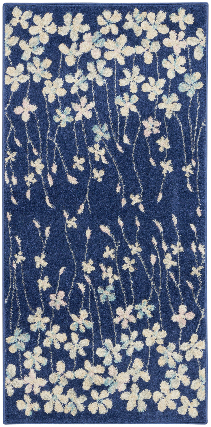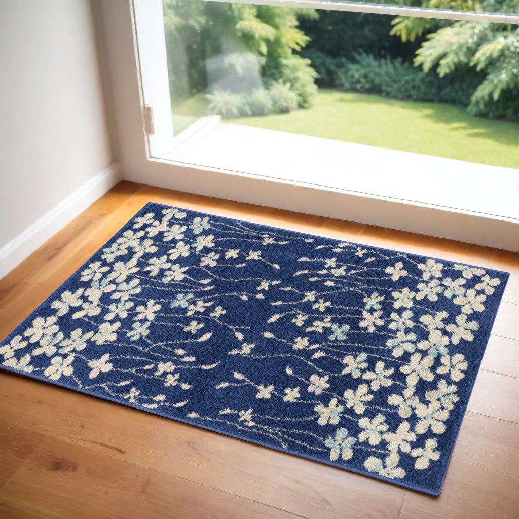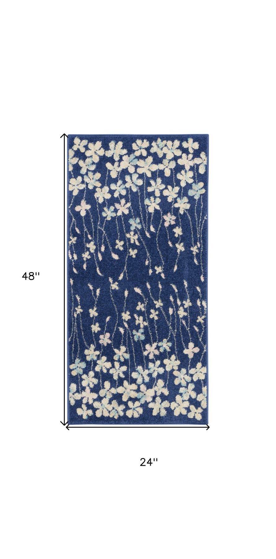 Add some artistry to your room with this 2-foot x 4-foot navy blue and ivory floral area rug. Ideal for spaces with kids and pets, this rug is stain resistant to help repel dirt and spilled liquids. Built to last, this rug crafted from polypropylene fibers is known for its durability and long lasting appeal. Rugs are a great way to showcase your style, hide imperfections, warm your home and reduce noise. This smaller sized, contemporary styled rug is just what you need for your walkway, bedside, in front of door, cabinet, refrigerator, or chair. 24-inch h x 48-inch w x 0.5-inch d.
