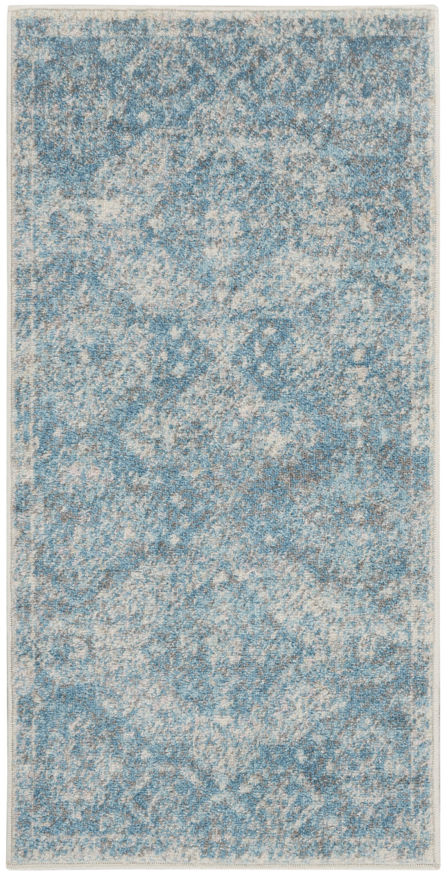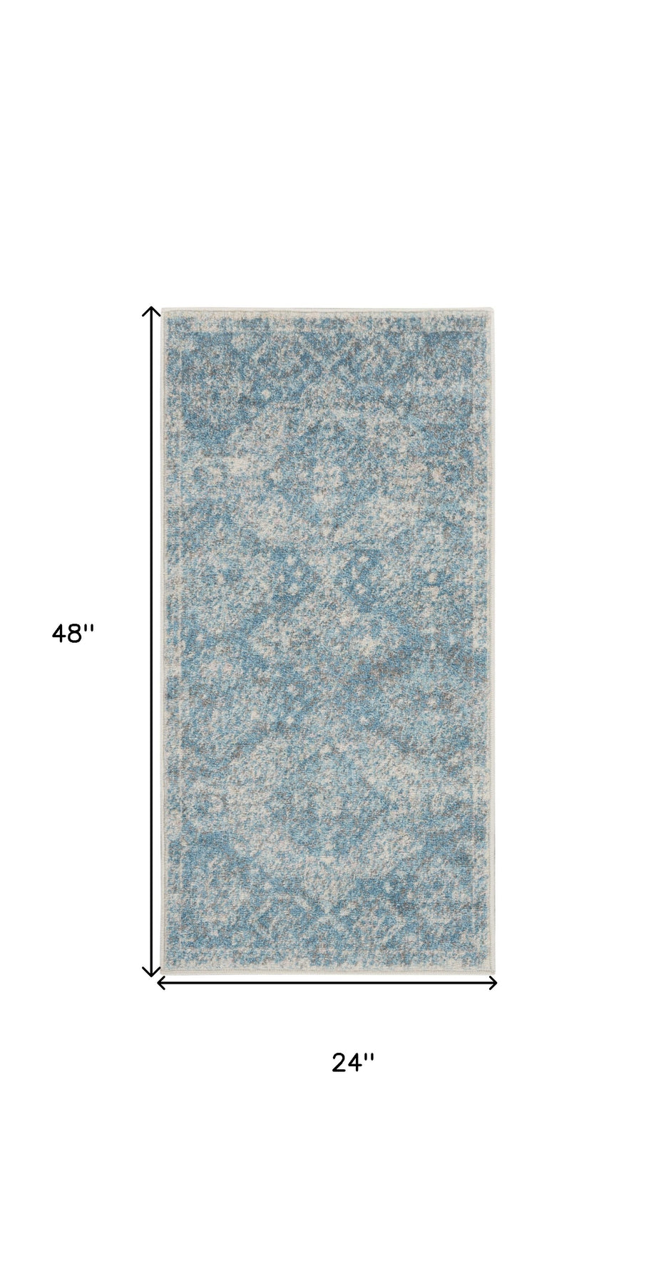 Add great coloration and comfortable texture to your space with this 2-foot x 4-foot ivory and light blue oriental distressed area rug. Ideal for spaces with kids and pets, this rug is stain resistant to help repel dirt and spilled liquids. Built to last, this rug crafted from polypropylene fibers is known for its durability and long lasting appeal. Rugs are a great way to showcase your style, hide imperfections, warm your home and reduce noise. This smaller sized, transitional styled rug is just what you need for your walkway, bedside, in front of door, cabinet, refrigerator, or chair. 24-inch h x 48-inch w x 0.5-inch d.