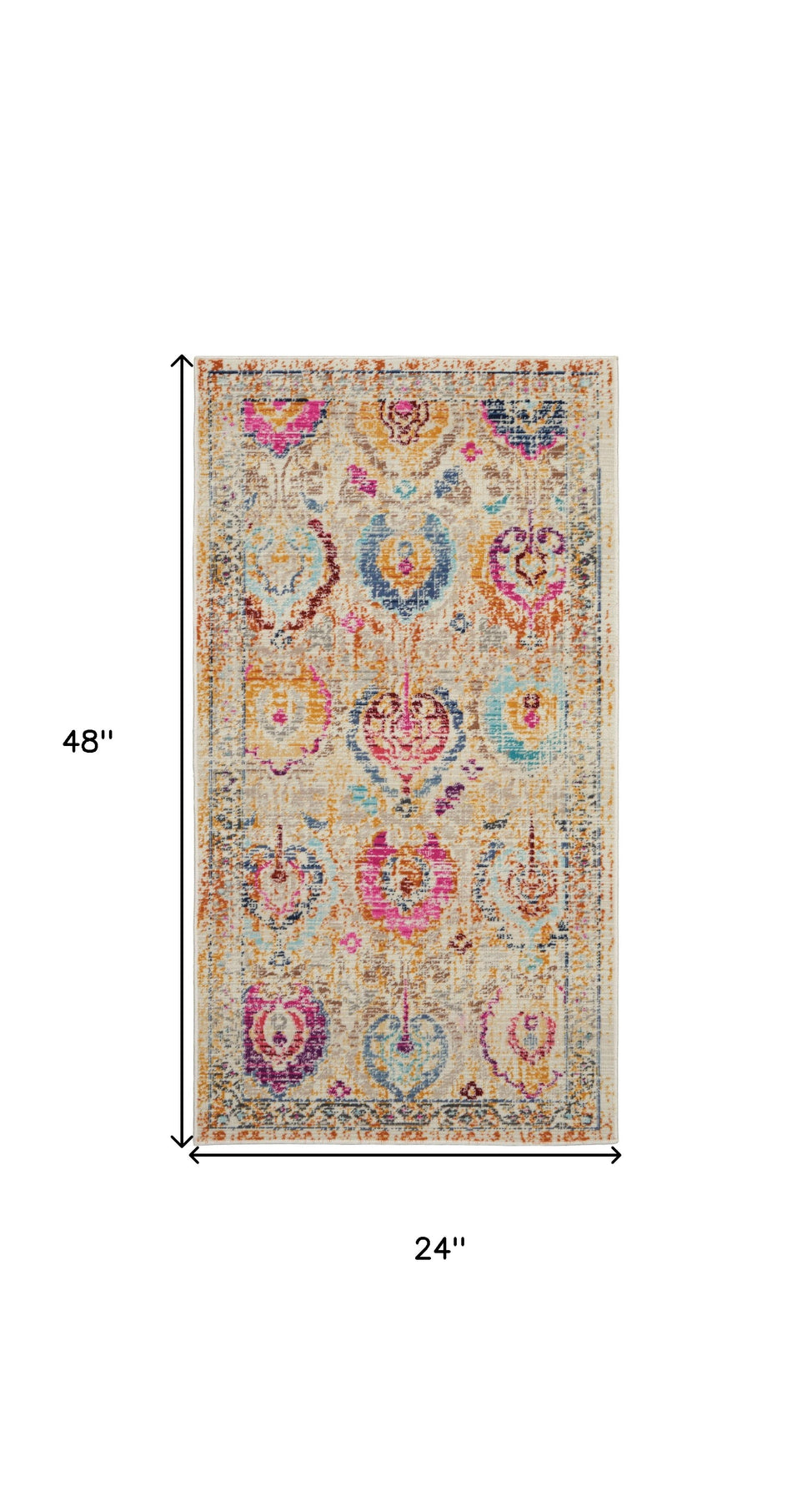 Set an inviting tone in your space with this 2-foot x 4-foot ivory pink and orange floral distressed area rug. Ideal for spaces with kids and pets, this rug is stain resistant to help repel dirt and spilled liquids. Built to last, this rug crafted from polypropylene fibers is known for its durability and long lasting appeal. Rugs are a great way to showcase your style, hide imperfections, warm your home and reduce noise. This smaller sized, transitional styled rug is just what you need for your walkway, bedside, in front of door, cabinet, refrigerator, or chair. 24-inch h x 48-inch w x 0.5-inch d.