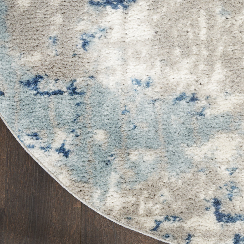 Add great coloration and comfortable texture to your space with this 4' blue and gray round abstract power loom area rug. This geometric round shaped rug features a abstract pattern in blue and gray that combines a good looking print with a unique and updated shape. The mix of shape, color, and design gives this rug refreshing visual interest. This superior Turkish rug represents the highest quality and is built to last. Area Rugs help to give warmth and sense of home to your space. .32" H x 48.00" W x 48.00" D