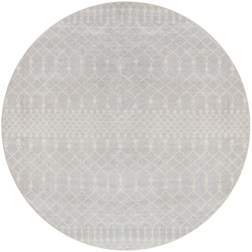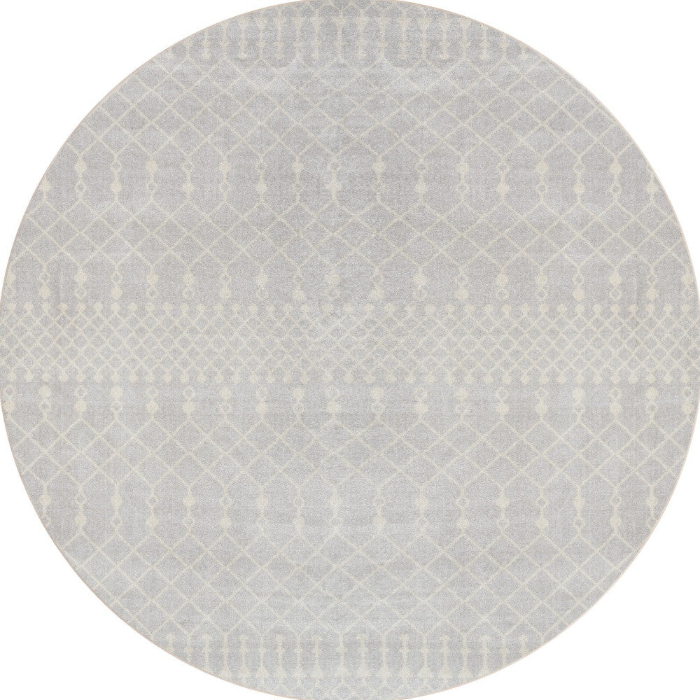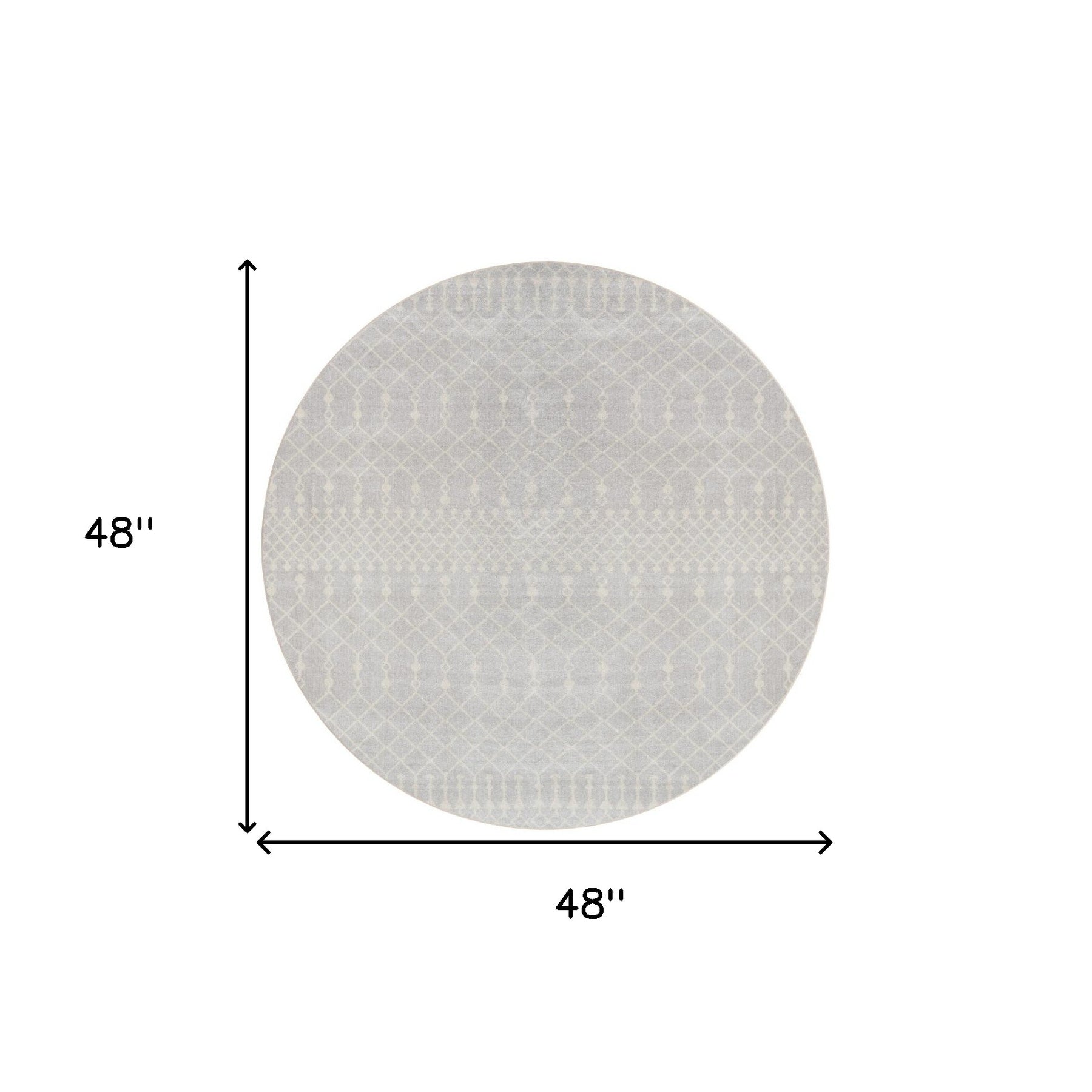 This 4-foot gray geometric power loom round rug, is a great way to add warmth to a room. This geometric round shaped rug features a geometric pattern in gray that combines a good looking print with a unique and updated shape. The mix of shape, color, and design gives this rug refreshing visual interest. 48-inch H x 48-inch W x 0.25-inch D