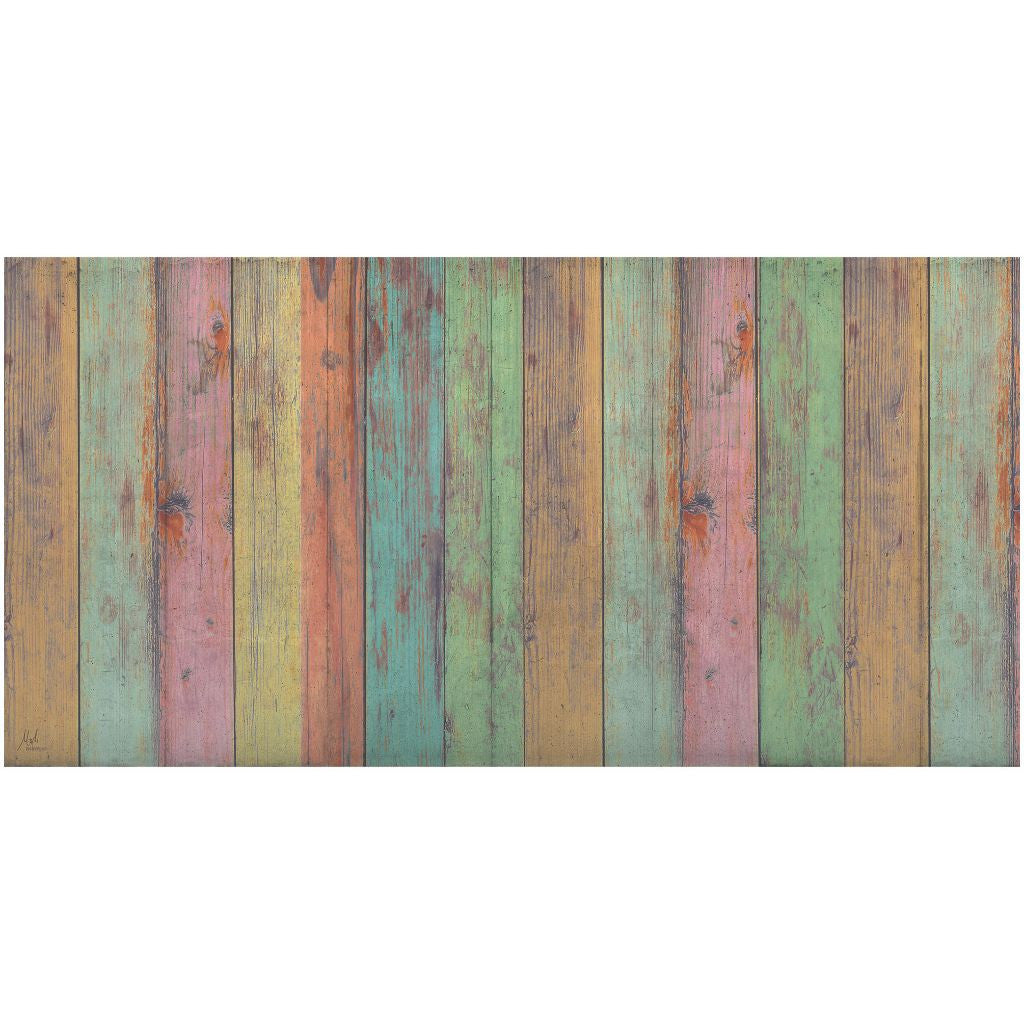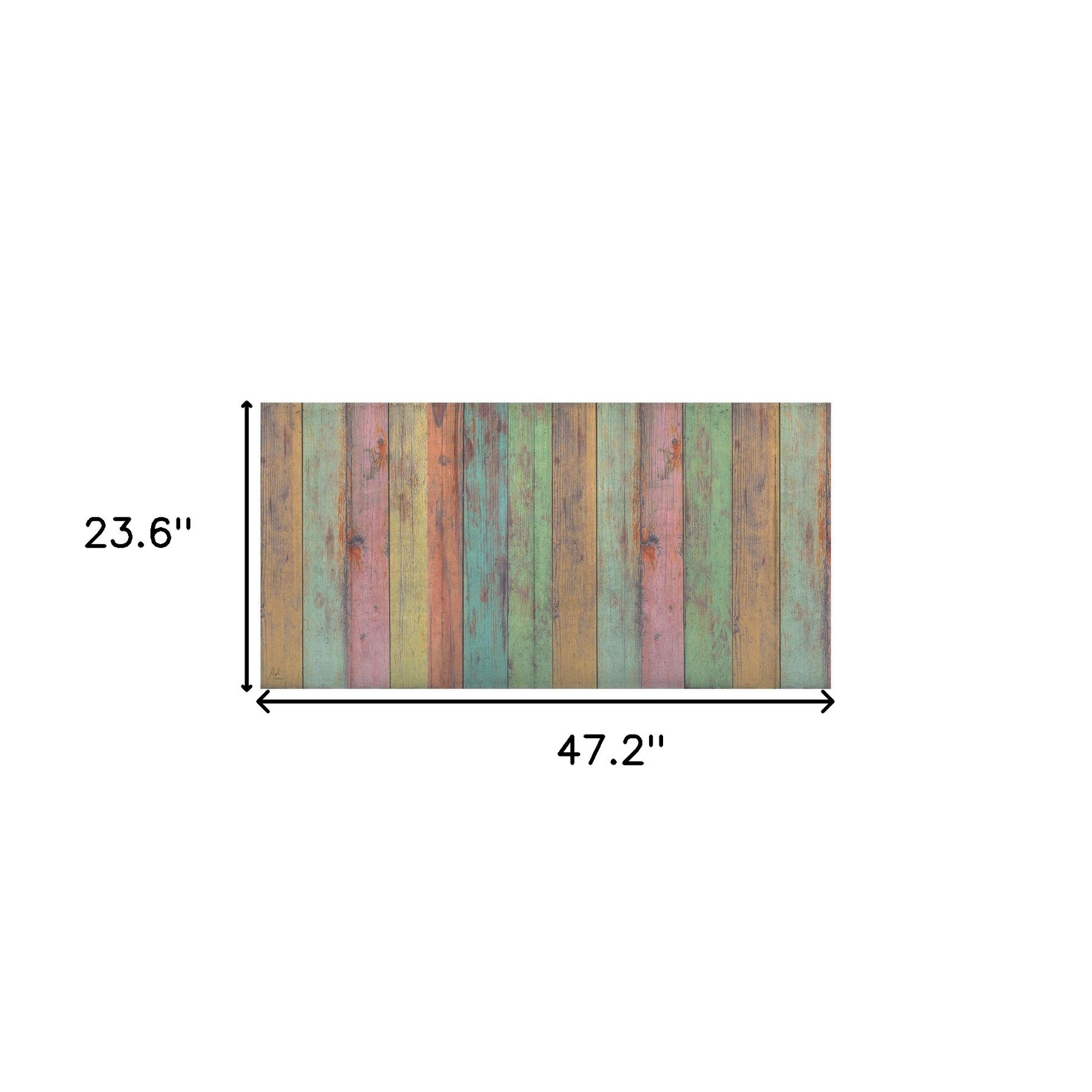 Set an inviting tone in your space with this 2' x 4' distressed aqua green and pink printed vinyl area rug with UV protection. This rectangle shaped rug features a striped wooden plank design in distressed aqua, green, and pink to give it visual interest. A classic shape marries with good looking design for your space. Ideal for locations with kids and pets, this rug is stain resistant to help repel stains and spilled liquids. This vinyl mat brings a beachy and casual vibe to your space, is easy to clean, and is built to last. 0.08" H x 23.6" W x 47.2" D