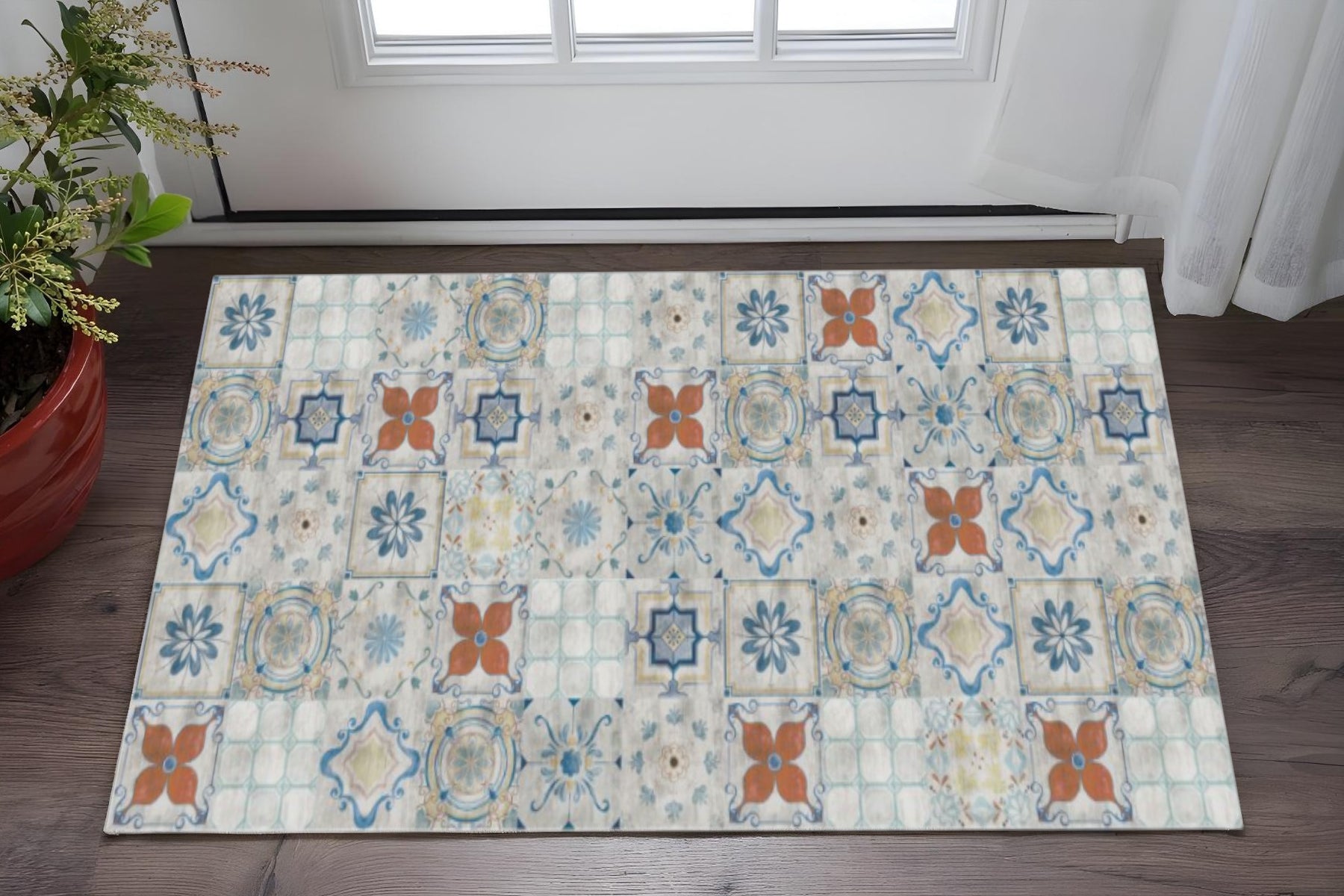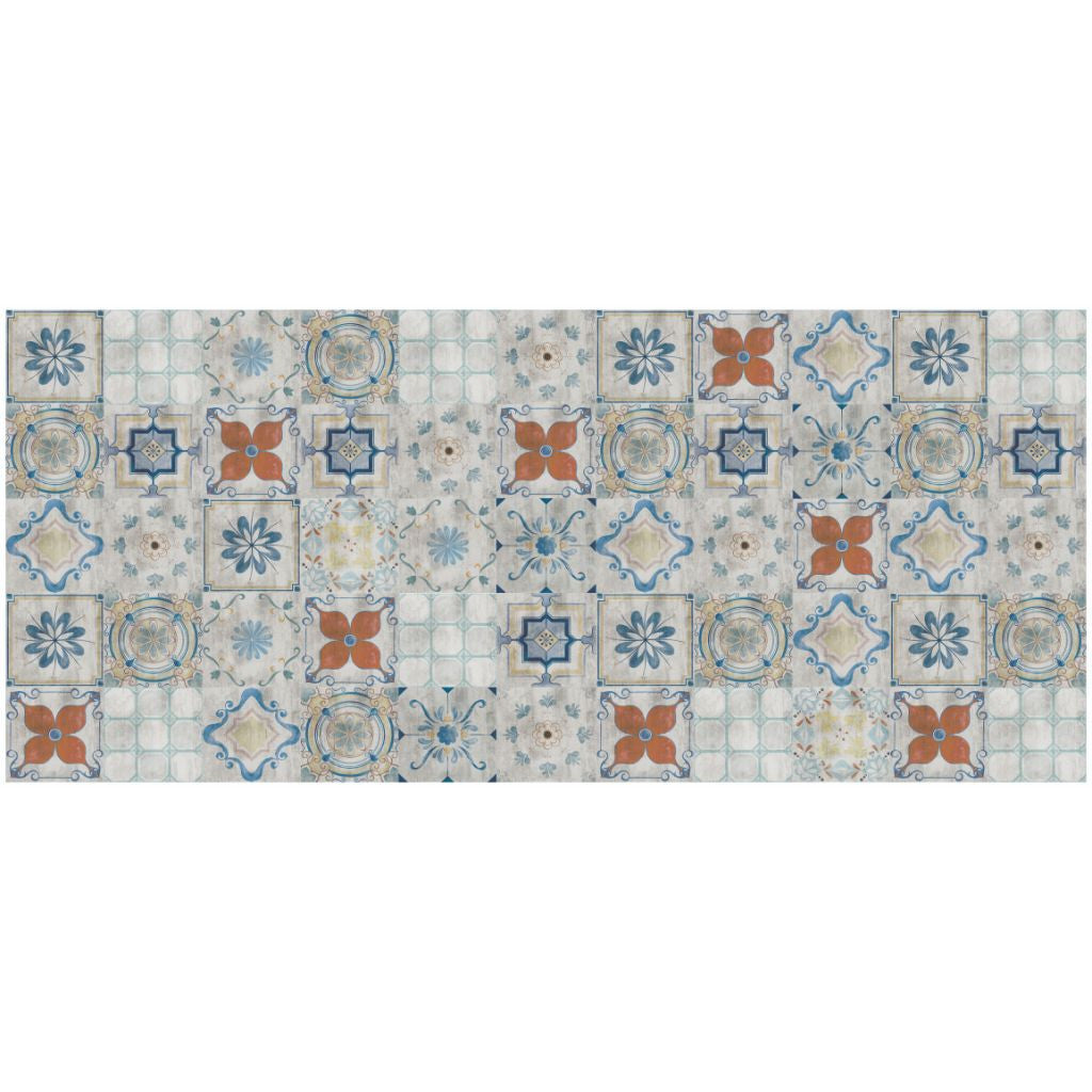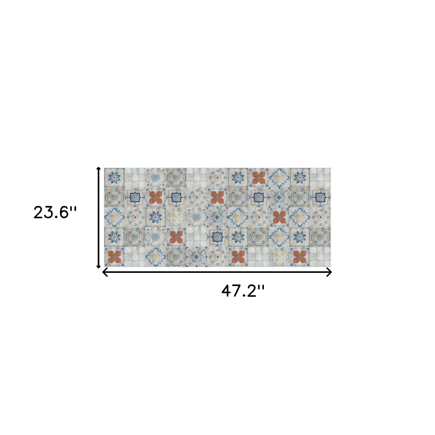 Set an inviting tone in your space with this 2' x 4 gray blue and rust mosaic tile printed vinyl area rug with UV protection. This rectangle shaped rug features a oriental design in gray blue and rust to give it visual interest. A classic shape marries with good looking design for your space Ideal for spaces with kids and pets, this mat is stain resistant to help repel stains and spilled liquids. Place this rug against a hardwood or tile floor and it will enliven your living space with style and European sophistication. 0.08" H x 23.6" W x 47.2" D